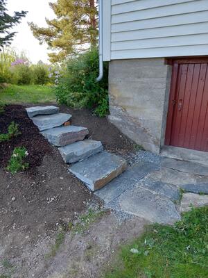 Aksel har lagt stein og laget steintrapp ved kjellerinngangen på Sandmo