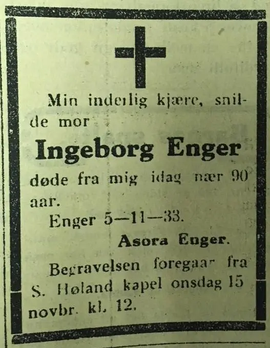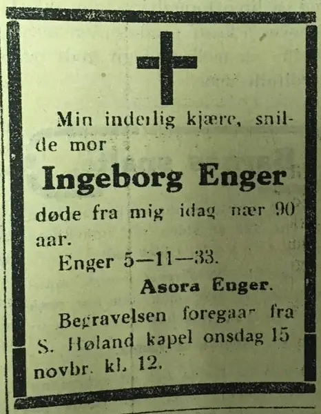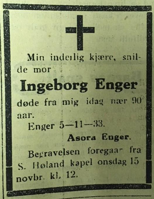 Hun var alltid på vakt, natt som dag, sommer som vinter. Ingeborg, eller «mor Enger», var en modig kvinne som hadde en egen evne til å overvinne vanskeligheter med godt humør og stor frimodighet.