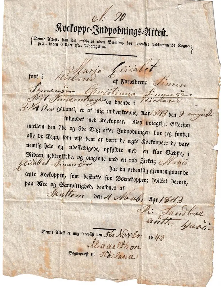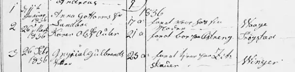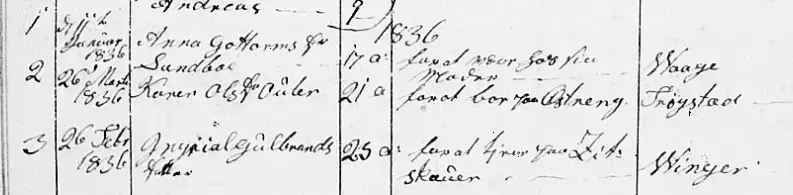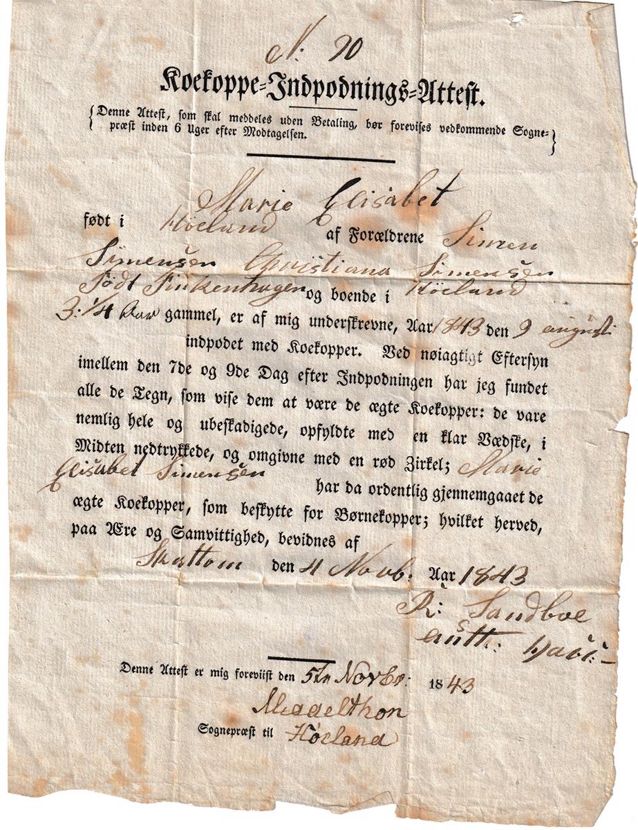 Kirkeboka i Opplandsarkivet i Vågå viser at Ronnog Jacobsd. Sandboe er registrert som utflyttet til Høland i 1833. Hun er da nevnt som examineret Gjordemoder.