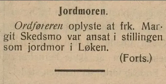 Hun var jordmor i Høland i over 40 år og var kjent som en dyktig og samvittighetsfull dame. Margit tok over jordmorstillingen etter sin mor, Karoline Riiser Skedsmo i 1916.