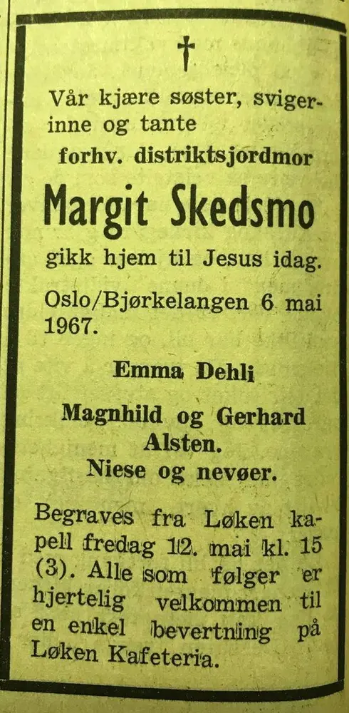 Kapellet på Løken kirkegård var fullt da Margit ble fulgt til sitt siste hvilested. Organisten spilte «Våren» av Grieg, og det ble lagt på kranser fra søsken, sykepleieforeningen og pensjonistforeningen. Marskalker var Georg Skedsmo og Einar Krogstad
