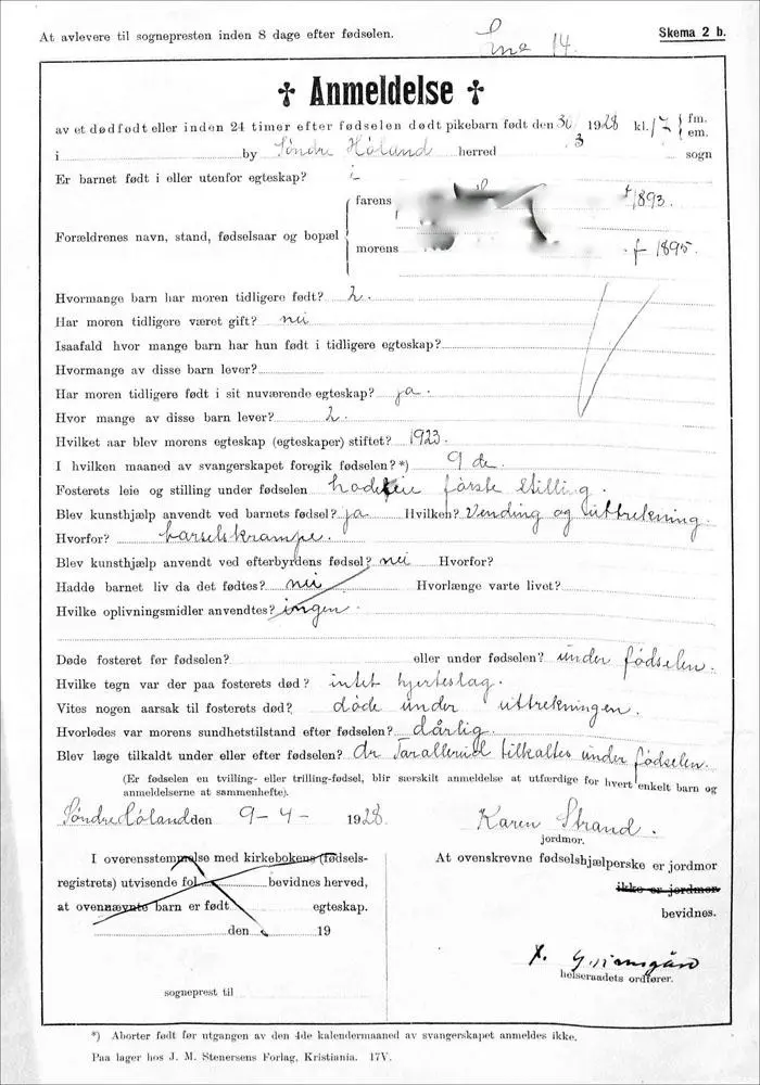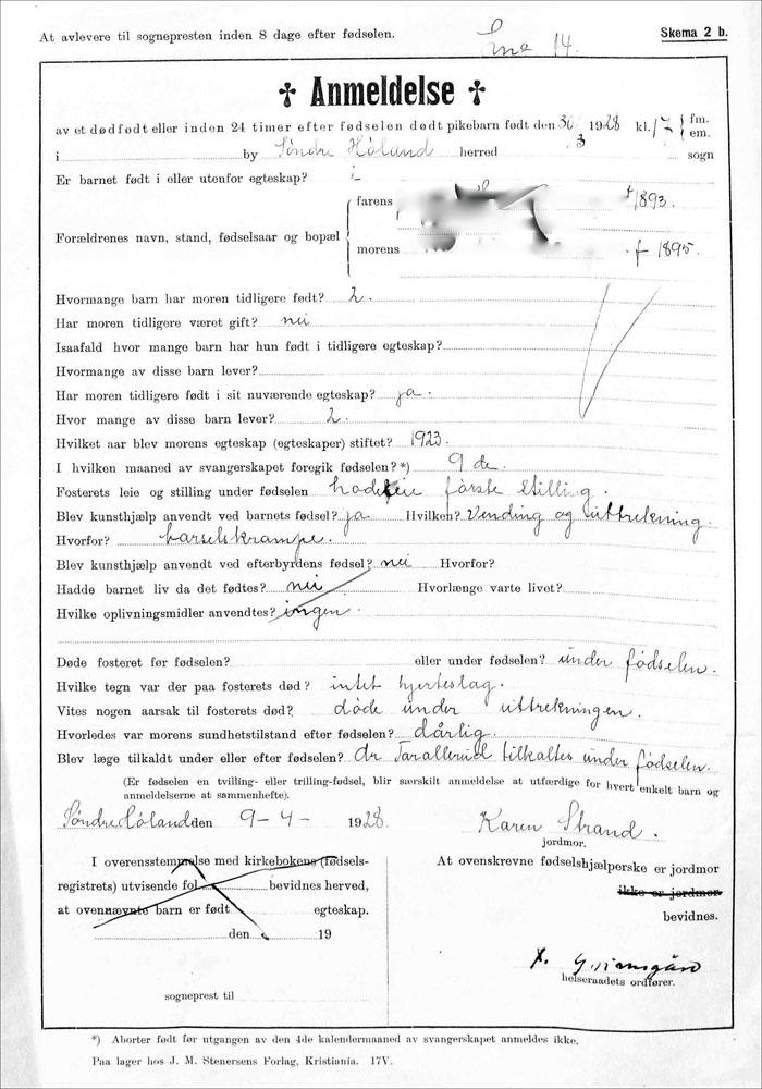 14. oktober ble hun hentet i Askim og flyttelasset ble kjørt til sykestua i Søndre Høland. Allerede kl. 04.00 påfølgende natt ble hun vekket, og første fødsel var i gang. En liten gutt på 2800 gram ble født kl. 14.30. Seteleie er anmerket og doktor var tilstede.