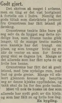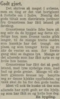Ved sin elskverdighet og sin likefremme måte å være på har hun vunnet sig mange venner, og sammen med disse vil vi gratulerer og ønske henne mange gode år fremdeles i ivrig virke for sitt hjem og for sin bygd