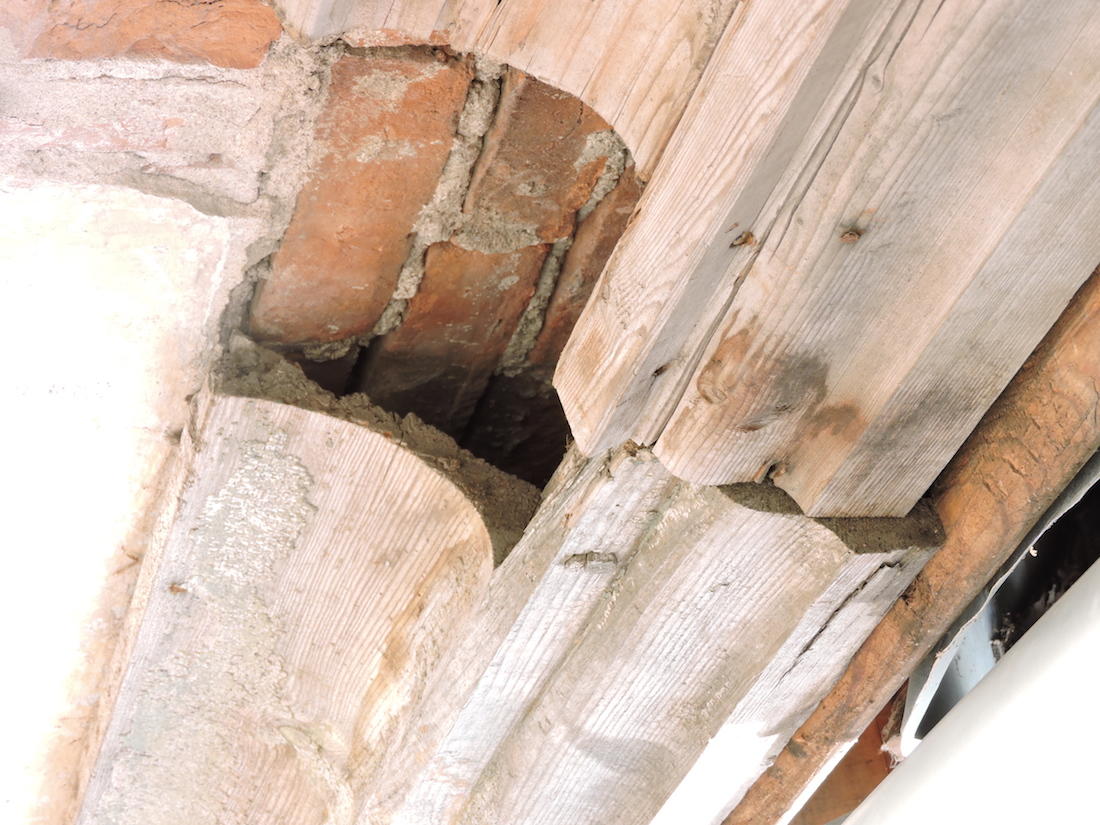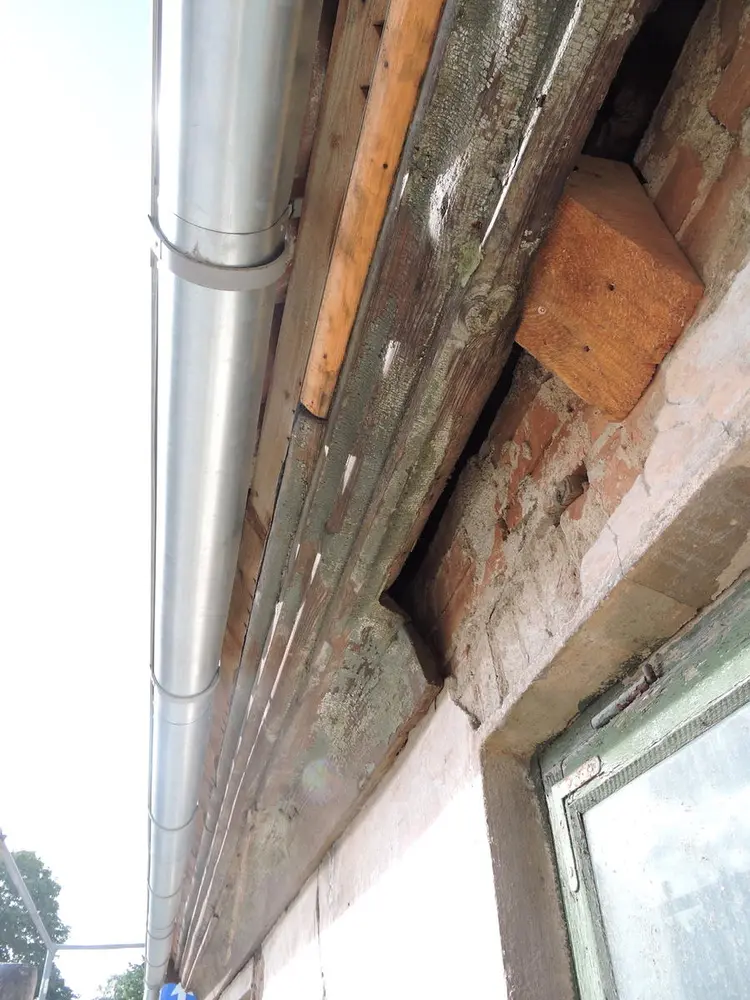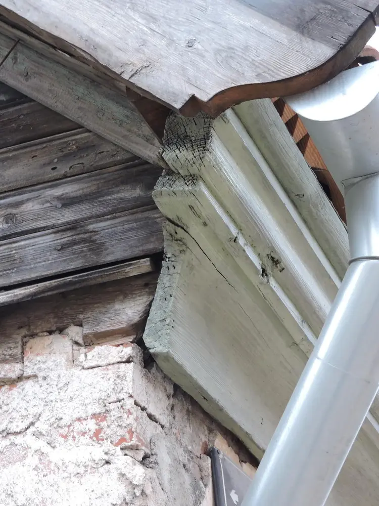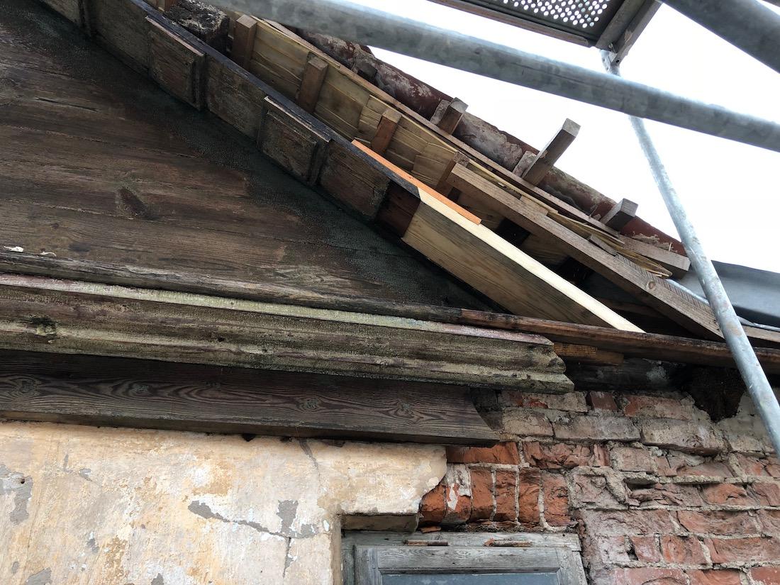 - Under utstikk i arken mot gata var det et bord som ble skiftet helt, mens et annet ble skjøtt i nedkant. Klossene var ok. Møneklossen var hogd ut i ett stykke.