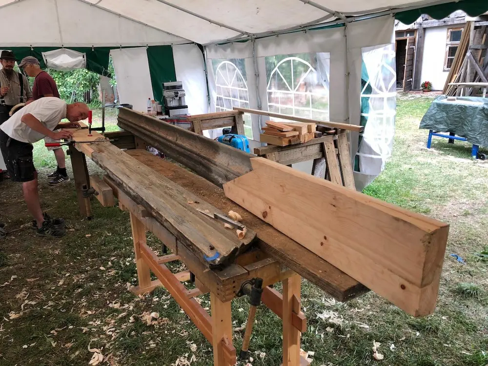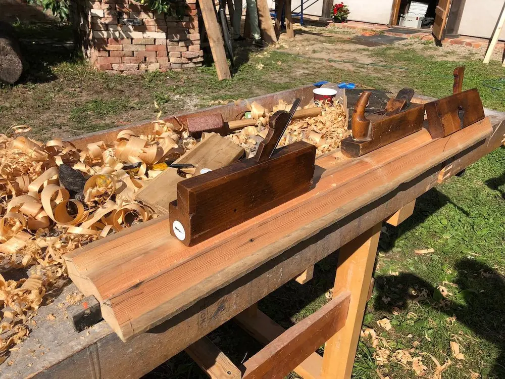 Vi hadde med to kofferter med tradisjonsverktøy, som forskjellige økser, teksle, huljern og mange høvler. Dette var nødvendig for å kunne utføre det krevende arbeidet, spesielt til profilbord i gesims og vindskier.