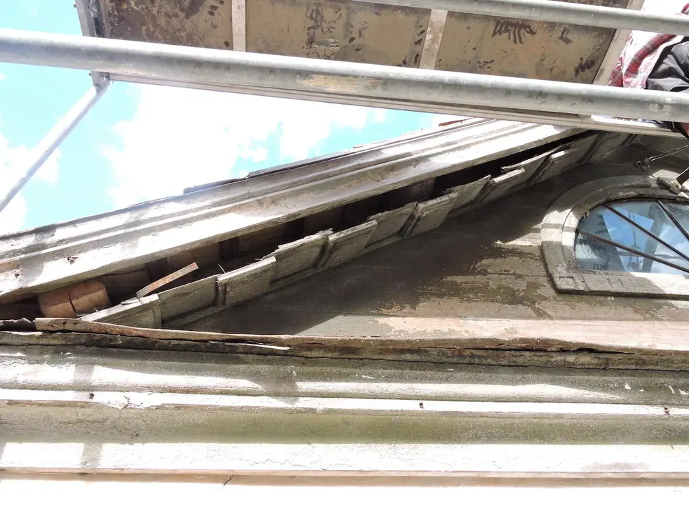 - De nyere profilerte bordene under gesims måtte delvis erstattes med nye. En del innfellinger var også nødvendig.