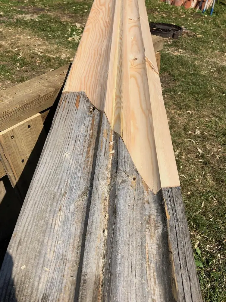 - Begge vindskiene, 3”x 11”, var råteskadet i nedkant, og ble kappet og skjøtt på før høvling av profiler kunne starte.
