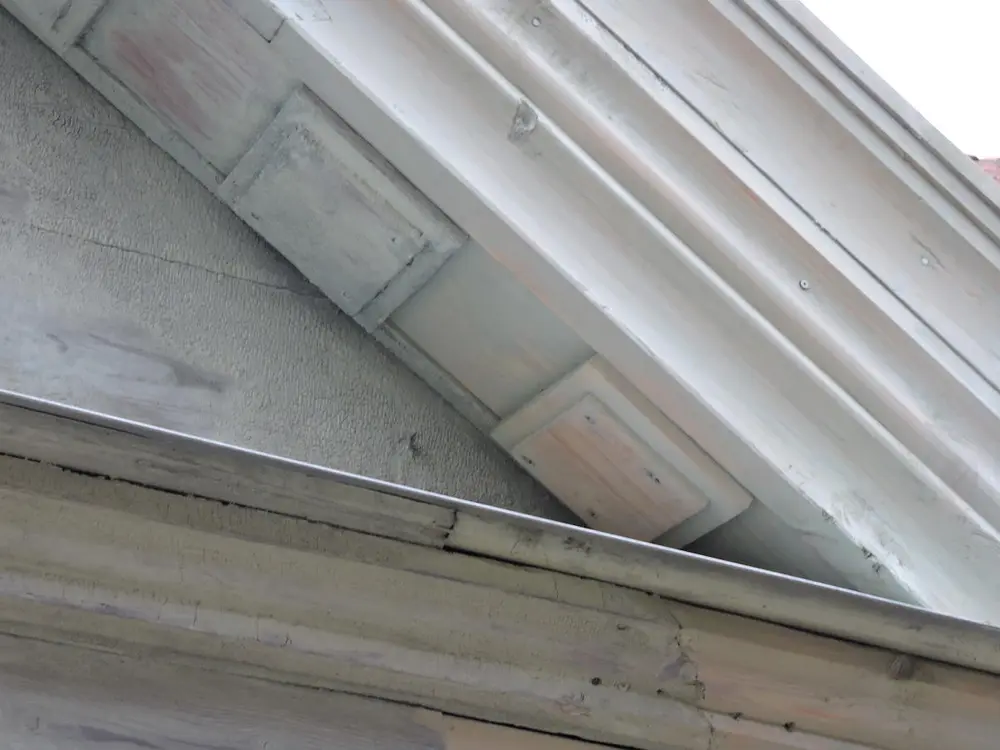 Den store arken har kraftige sammensatte vindskier i dimensjon 3” x 11” + 3” x 5”, også med grove profiler. Under utstikkene i gavlen mot gaten er det kraftige bord med påspikrede klassiske klosser(mutulus, kassetter) med trapp på kanten. Det var til dels store råteskader som måtte utbedres under utstikkene.