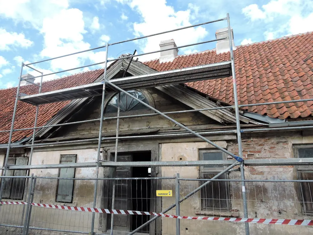 Workshopen ble arrangert i Raina gate 5, en murbygning fra 1780-årene, med sperretak og stor ark mot gaten. Under gesimsen mot gaten er en skråstilt grov plank, 3” x 14”, mellom murvegg og utstikk, med store barokke profiler. Den er delvis opprinnelig, men har også noen påskjøtinger fra sovjetperioden. Råteskader etter vannlekkasjer i kilrenner og dårlig utført reparasjonsarbeid måtte utbedres.