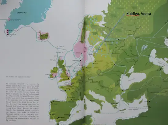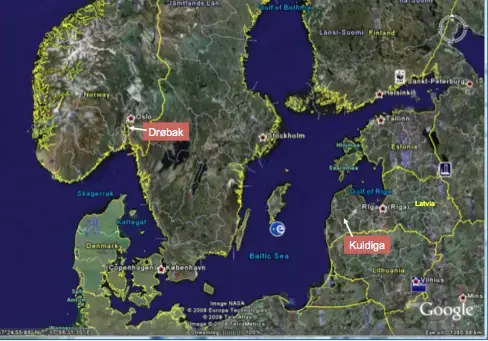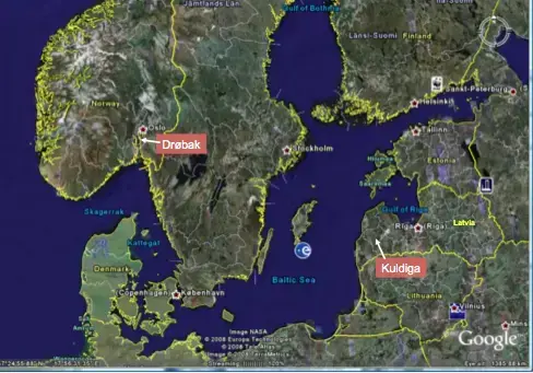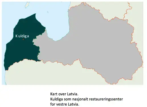 Kuldiga by ligger ved bredden av elven Venta, 60 km inn i Latvia fra Østersjøen. Fra Riga er det to timers biltur. Byen er kjent tilbake til 1200-tallet, og var en av mange viktige handelsbyer i det store Hansanettverket, hvor også Bergen var med.