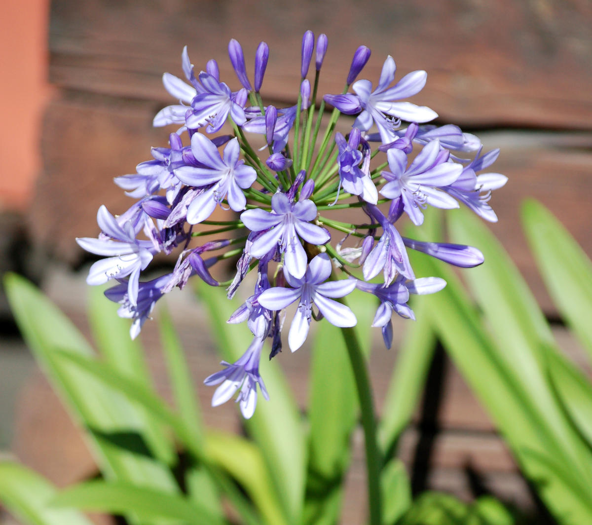 Beskrivelse: Opprinnelig fra Sør – Afrika. Lettdyrket staude med kraftig rotsystem. Stor bladrosett; mange elegante buede blader som er opptil 30-70 cm lange og 4-5 cm brede. Visner ikke i løpet av overvintringen. En plante kan få flere opprett kraftige stengler som er 50-60 cm høye. I toppen sitter en rund stjerneskjerm av blålilla eller hvite, traktformede blomster som springer ut etter hvert. Planten har kjøttfulle røtter som kan skades ved ompotting, så vær obs på dette. Formeres ved deling om våren eller tidlig høst etter avblomstring. Skal være et par vekstpunkter i hver del.