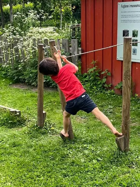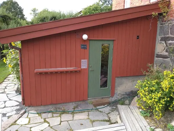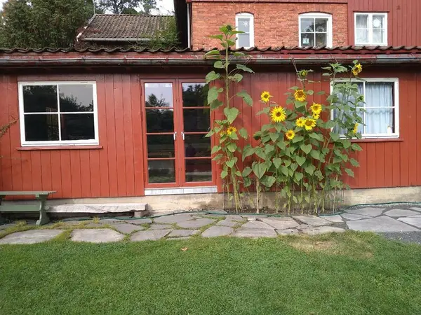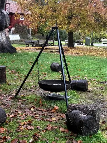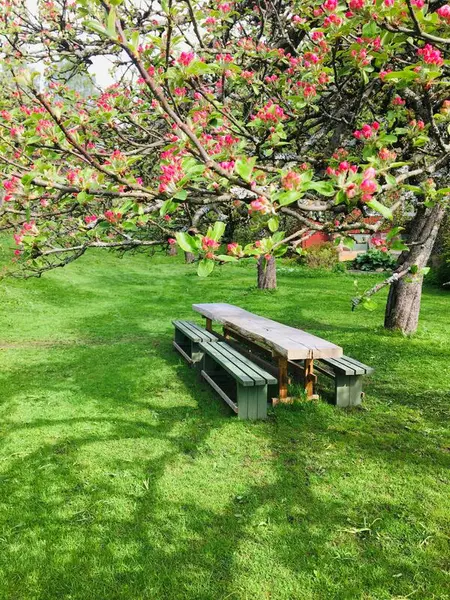 Her kan du nyte et hyggelig måltid ved langbordet under de vakre epletrærne. Vi anbefaler piknikvarianten, det er ikke kjøkken der. Vi kan tilby en kokeplate(induksjon) for å varme opp pølser – og museets bålpanne står til fri benyttelse. Den er plassert på lekeplassen vår (må ikke flyttes derfra).