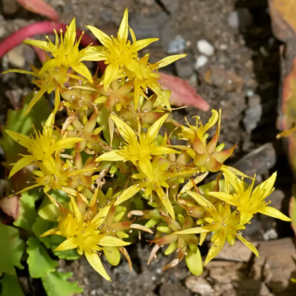 Beskrivelse: Gullbergknappen er i slekt med ca 400 arter. Opprinnelig fra nordøstlige Asia. Den er en sukkulent som vil si at den kan lagre vann i blad og stengel og som dermed tåler litt tørke.Vintergrønn, teppedannende staude med utløpere. Små, ovale, tykke og grovtannede blader spredt oppover stengelen. I toppen sitter små, gule og stjerneformede blomster. Høyde på 15-20 cm.