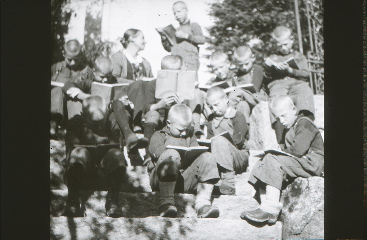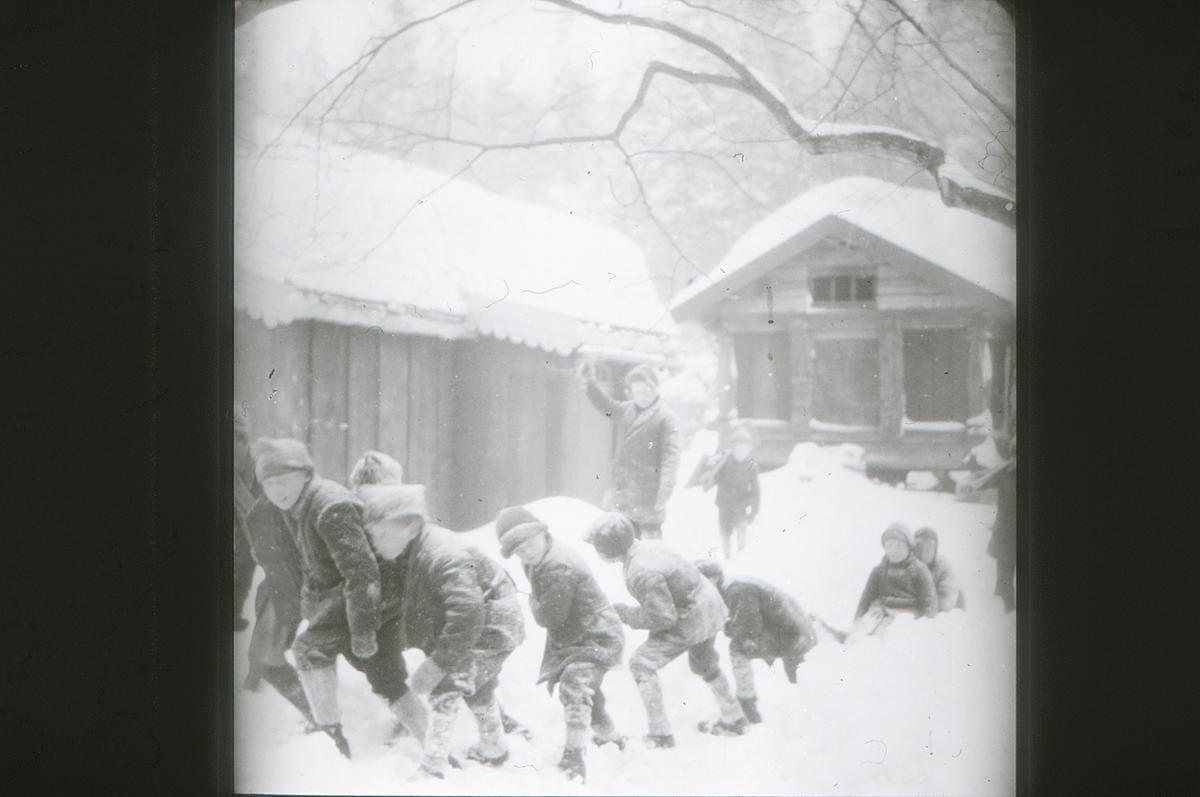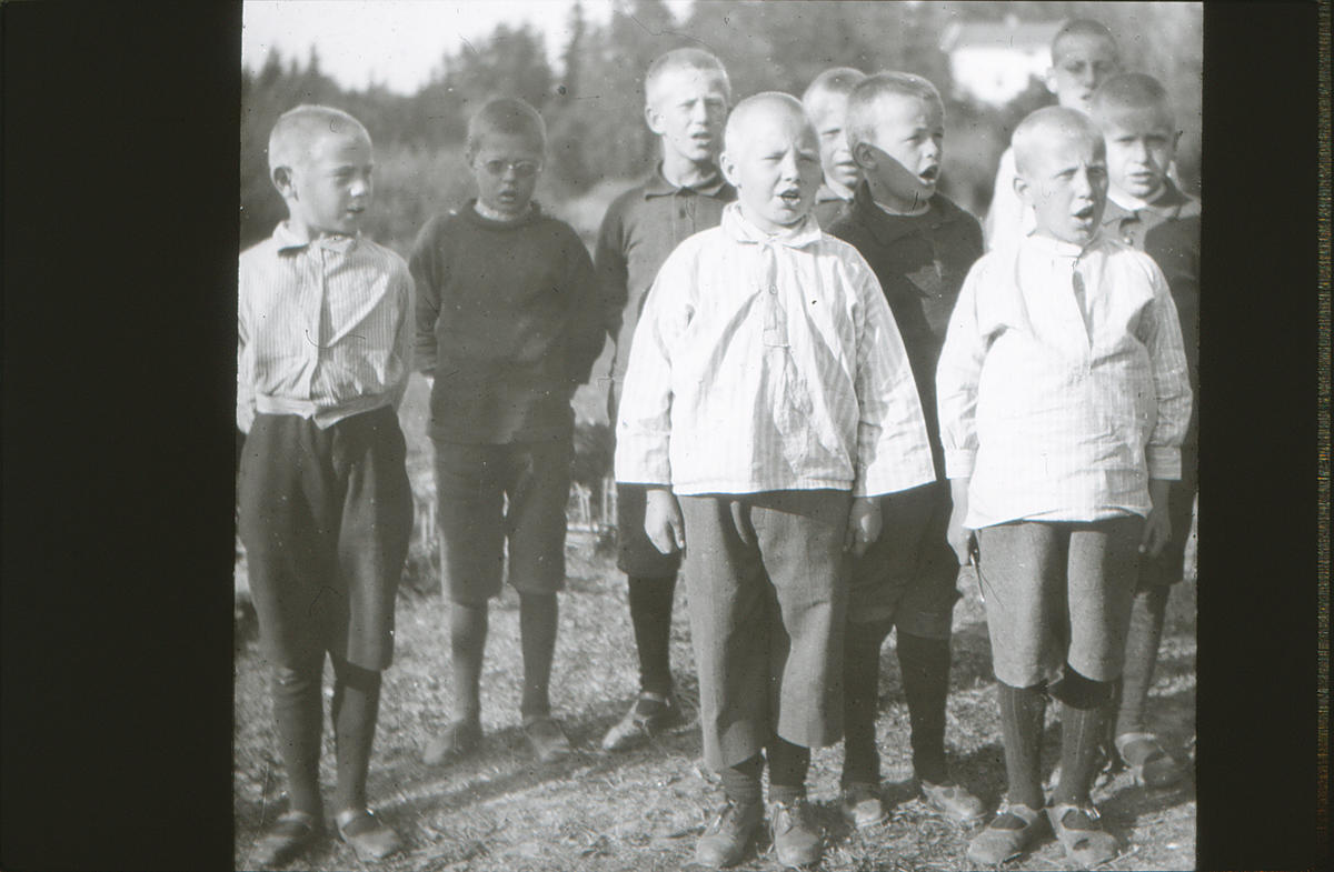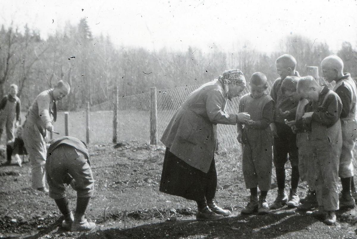 Dr. (Dagny) Bang tok guttene ut. Aa, jeg husker det vel ! De så dårlige ut – de første 10 guttene, kjertelsvake, anemiske, nervøse, far eller mor var døde eller det var forskjellig som ikke var godt der hjemme. Man så i ansiktsdraget at sorgen hadde merket dem. Det var den 12. januar i 1921 vi brautet oss frem mellom snøfanene. Vinteren var usedvanlig streng det året, mye snø, mye kulde dyrtid og streiker – jernbanen stod, vondt å oppdrive både mat og klær. Men det gikk som i ordsproget: Når nøden var størst, var hjelpen nærmest, dog gleden ved å se barna komme sig på kropp og sjæl feiet sorgene vekk. All begynnelse er svær. Kristianiagutter i den viltreste alder er ingen lett sak. Alt skal læres, spise og tygge – de sluker -. Så skal de lære å stå og gå, snakke pent til hverandre, ikke brøle og sloss. Barn har lært sig til å skrike om kapp med biler og sporvogner i Kristiania. De er ikke til å ha i hus, og ute i stillheten er de som varg i veum. Vi slet den vinteren og næste med. Det gjelder ikke å få en hel ny besetning. Der må være noen av den gamle garde til å lære op de nye. Barn lærer mer av eksempel enn av ord, mer handling, mindre tale!