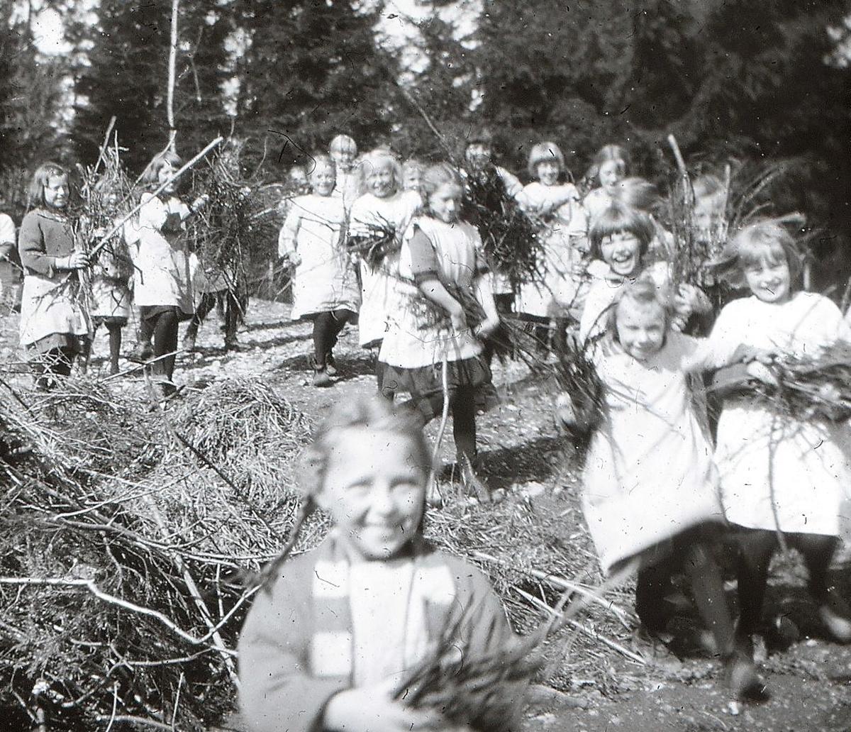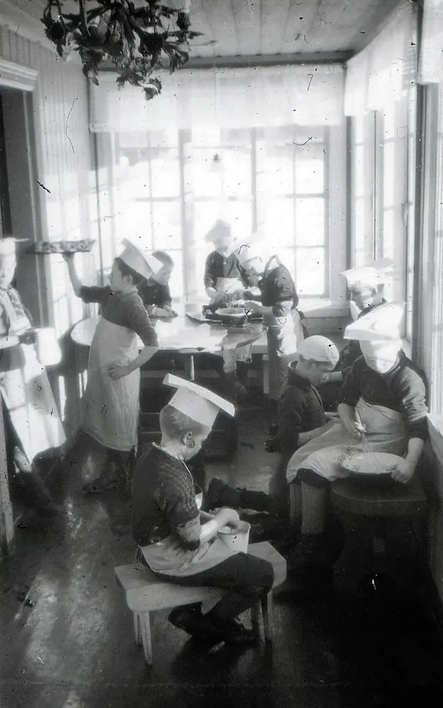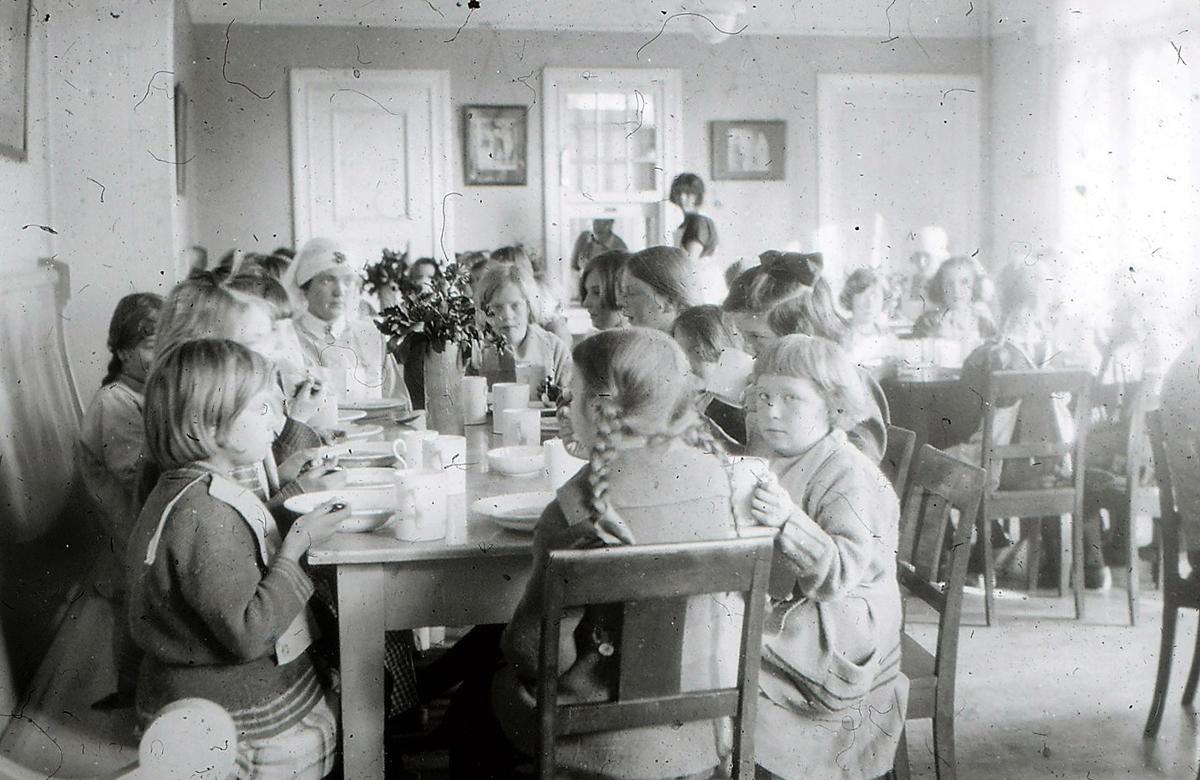 La oss så efter denne avstikker fare til Stockholm og stige opp de mangfoldige trappetrin til Engelbrekts skolens tak hvor vi finner en 20 – 30 barn samlet på terrassen, gutter og piker i alle aldre – uten annet tak over sig enn Guds frie himmel. Det er mars – surt og koldt, barna har fåreskinnspelser på og votter.Tallene de skriver, blir ikke så fine just, men ansiktene får en kraftig kulør. Dette er barn som kommer fra tuberkulosesanatorier – har åpen tuberkulose – kan ikke gå i ordinære skoler. Det er herlig utsikt fra taket. Engelbrekt skolan ligger høit, en seiler liksom over et hav av huser og tårner og Målaren i blå slyng rundt Gamla staden. Det er en ypperlig anskuelsesundervisning. Det grønnes på markerne, isflakene farer til havs, det er våren som slåss med vinteren. Og himlen får de studere – jo de lever i kontakt med naturen heroppe, og Stckholms kirkeklokker ringer sin høitid inn i barnesjelen. Men vi syntes de små Stockholmerne på takterrassen lignet store fugler som flakset med vingerne, men lenger enn til terrassens murkant kom de ikke. De møtte opp som de andre barn ved ½ 9 tiden. De sang, de leste, spiste, hvilte, lekte og tok efter tur del i huslig arbeide. Da vi var der så hadde guttene tur på kjøkkenet. Kalle og Pelle bakte brød og en liten fyr pusset kasserollen så blank at en kunde speile sig i den. «Tycker fru`n inte han er mycket gentil?» spurte han, stolt over sitt verk. Og lærerinnen fant guttene vel så flinke og greie som pikene i kjøkkenet.