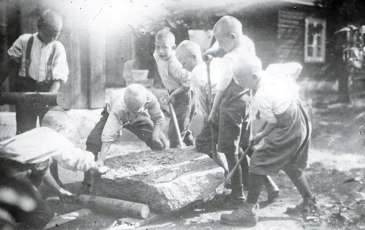 Så har vi ødeleggelseslysten. Kan en bil få stå i fred? Kan en benk, et bord, en skolepult få holdes fri for merker og snitt? Det er barnets trang som ikke får noen sund utløsning i byen. Det klør i fingrene efter arbeide. Det ligger da Gud skje lov i barnenaturen fra det sitter i mors fang og griper efter koppen og sjeen. Det er vi som ikke vet å forstå deres arbeidstrang, sysselsette dem i byen. Det er byen, ikke barna som har skylden. Barnas arbeidstrang er det som i byene blir til skøierstreker – til skurkestreker – til små forbrytelser, og så er vi på skråplanet. De beste emner går tapt på den måten. Landet fanger barnas skaperevne. Der er sand og jord og sten, der er bekker å demme opp og en fossekall å sette i sving og båter lage osv.