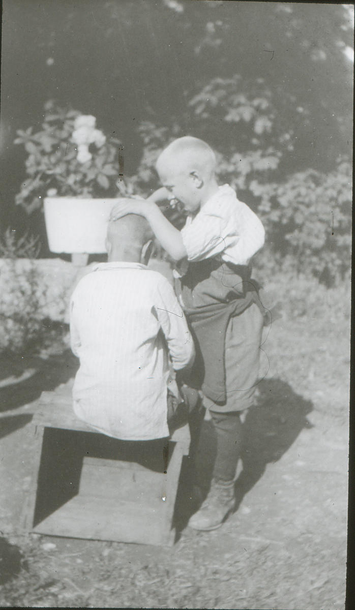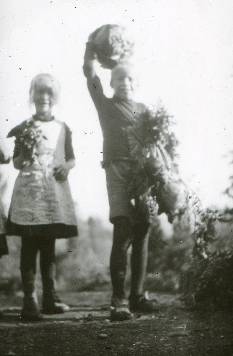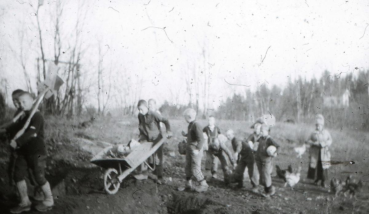 Vi hadde glede av guttene. Vi kunde ta dem med som våre egne barn til prest og ordfører. Bygden som hadde vært redd en slik invasjon – bybarn er ikke velkomne for haver og jordbruk – ble glade i dem. Askerfolk har vært snilde, og guttene var høflige og blide, hjelpsomme med småtterier som granbar for dørene, plukke små blomsterbuketter, lage sopelimer og visper – du vet det er så mangt som kan gjøres, når de blir satt til, og så sang de, og sangen er er hjertetyv. Vangenguttene hadde Otto Valstad til å lære sig å synge, sang var det beste de visste og de gledet mange. Til Gamlehjemmet drog vi Julekvelden. De hadde hakket (strikket) sig røde toppluer og i toppen var en dusk som viste hvad de skulde bli. Smørbokk, han het så/for han hadde lagt på sig 12 kg. På 10 måneder, han vilde bli jordbruker og hadde grøn dusk, smeden svart, pølsemakeren kjødfarvet.