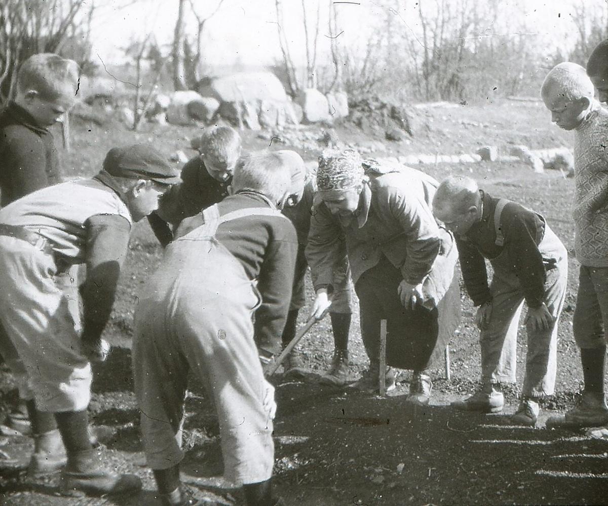 «Det herre er naturhistorie», sa en liten fyr, vi stod overfor en maurtue. Jeg er aldri oprådd for undervisningsmateriel, vi har naturen å øse av «aa, kall metemarken er frøken» sa en. Det står i naturhistorien og vi lærte det som et dogme, at krypdyr og slanger er kaldblodige dyr. Vi leser ikke, vi erfarer, og ingen glemmer når de får metemarker og firfisler i hånden at blodet deres er kaldt og varmt som luften. Guttene er især ivrige til å pønske og utforske naturens mysterier og å finne. Av dem får jeg rare stener, sjeldne blomster, gamle knokler og skaller. Nå er det en hesteskalle som næsten er ferdig til å innlemmes i samlingen og i maurtuen ligger skjelettet av en skjære, som maurene holder på å polere. Hvad de finner og hvad de ser bringer de med – de er opptatt med å presse de siste blomster når sommeren står på reise…Og tenk hvad de lærer i alle onner som for bybarnet går uenset hen. Vi har våronn med såing og setting, der hvert skud er dyrebart, og da alle er optatt med å stelle med jorden, den skal gi oss maten. Fremfor alt legger poteta beslag på hver eneste en, både når den skal i jorden og når den skal optaes. Det siste er basen (høydepunktet) – å telle de ongene som poteta har fått i sommerens løp. Ja, det var en potet på Vangen som fikk 48 barn – 48 fold. Nu går også begrepet fold op for dem, og mange andre begreper som for et barn i byskolen er dunkle. Dekal og hekto-liter og vi veier epler og plommer, og kilo med alle underbenævninger glir ubemærket inn. Vi fyller hekto-liter med poteter og dekal med plommer og epler. Alt blir så klart som fot i hose. Og den beste anskuelsesundervisning som foregår ad naturlig vei. Slik at de selv er oppdageren, selv opplever det, byskolens anskuelse og enn mer skolefilm vil gjøre barna fantasiløse og kjedsommelige.