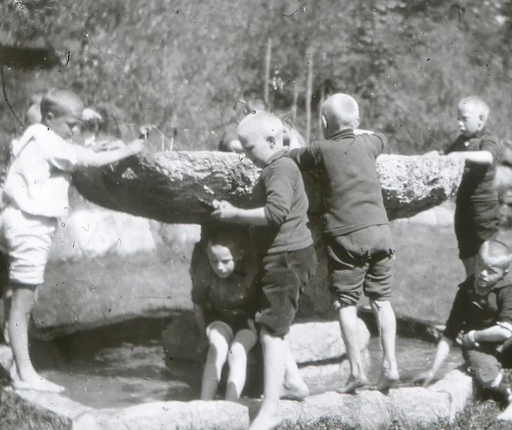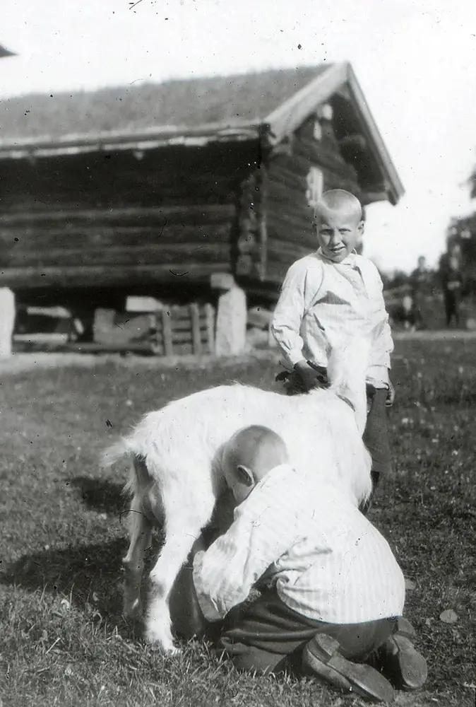 Vi fikk også en innføring i Ottos museumsplaner. På låven hadde han sine arbeidsrum, hvor vi i høst og vinterkvelder satt med sandpapir og pusset gammelt jernskrot som vi guttene kalte det. Mesteren selv fortalte eventyr. Jeg hadde forresten en vemmelig jobb i lange tider. Rustne, svære håndsmidde spiker skulde pusses så de skinte. Disse er brukt i museets gamle hus. Turer og lek blev det også tid til. En tur jeg husker godt var en tur til Sylling. Vi gikk på våres ben over Sem, Tveter, Rustan over skogen, frem til Sylling prestegård. Hvor vi overnattet, var i kirken om søndagen, startet opp og gikk tilbake til Hvalstad og Vangen. Skaugumsåsen blev besteget fra flere kanter. Vakås skogen var villmark for oss, her lekte vi og her gikk vi på ski, her laget vi skibakker og snøhytter. Det var naturlig for oss å beundre Hvalstaddalens storhoppere , og vi tok etter disse så godt vi kunde. Strikke lærte vi også. I de mørke høstkvelder blev det til hver vår røde fine nisselue. Tenk på røde nisseluer på 10 Vaterlandsgutter, på ski på vei til Bakkegårdene en førjuls dag. Ungene der oppe i grenda var overbeviste om at nå var nissene i gang med arbeide til jul.