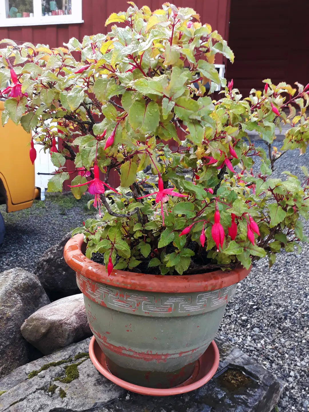 - G: En hengefuksia (i potte) med kraftige grener og store blader. Rosa røde begerblad og mørk lilla kronblad. 60-70 cm høy.