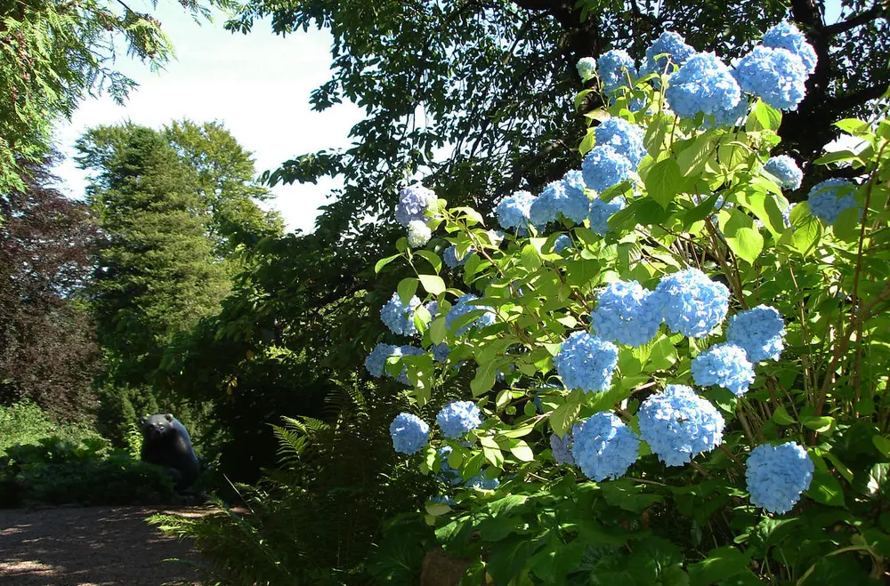 - Blå hagehortensia plantet i Ørnebedet foran altanen til Hovedhuset.