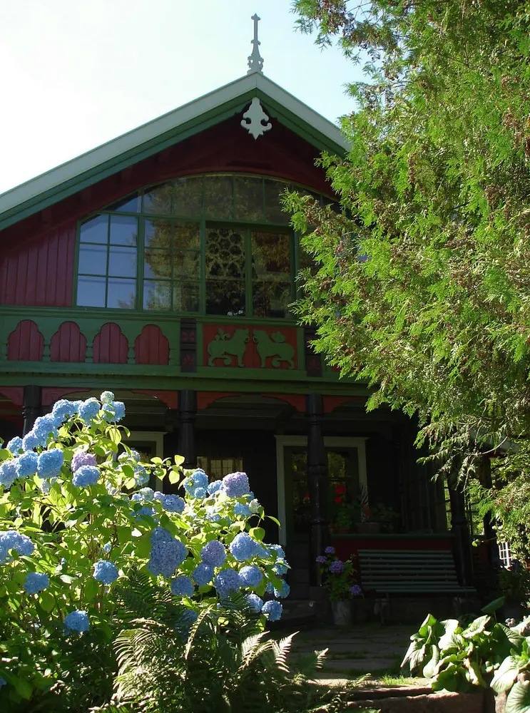 Blå hagehortensia utenfor Hovedhuset. Foto: Liv Bjelland
