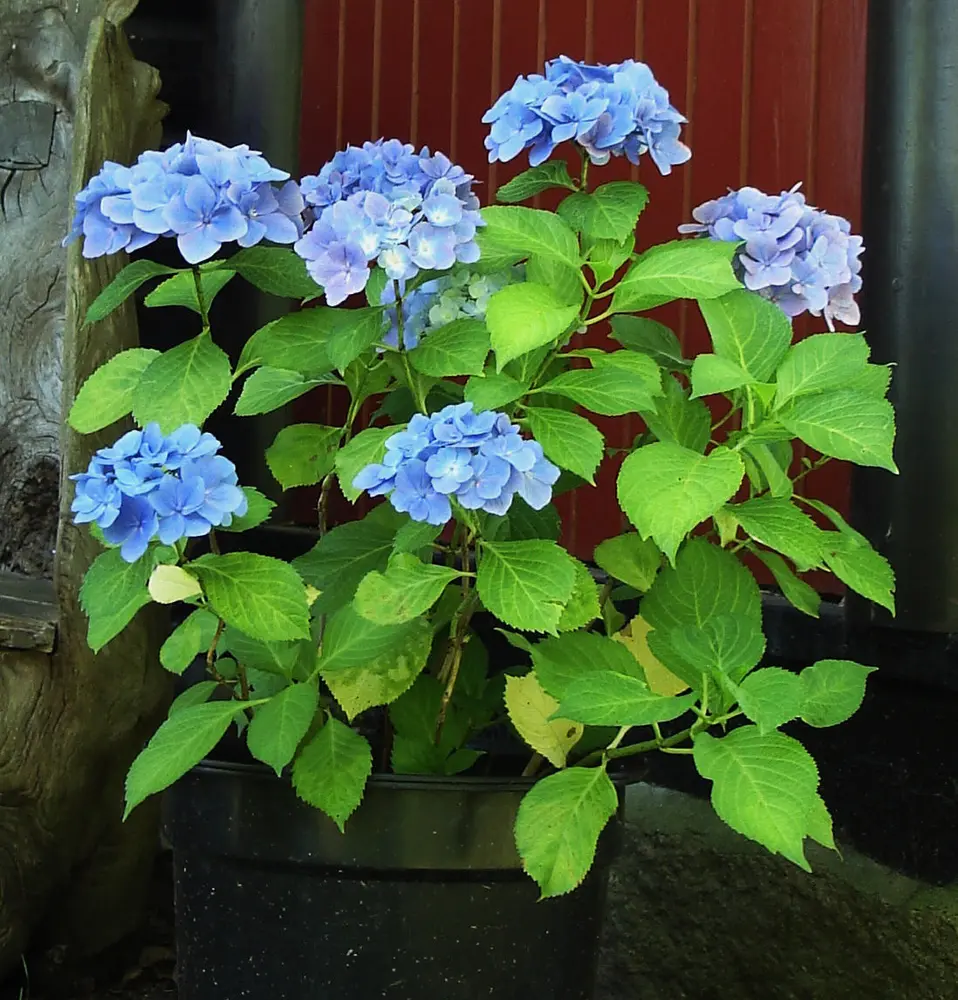 - To blå Hortensia i krukker ved altanen til Hovedhuset.