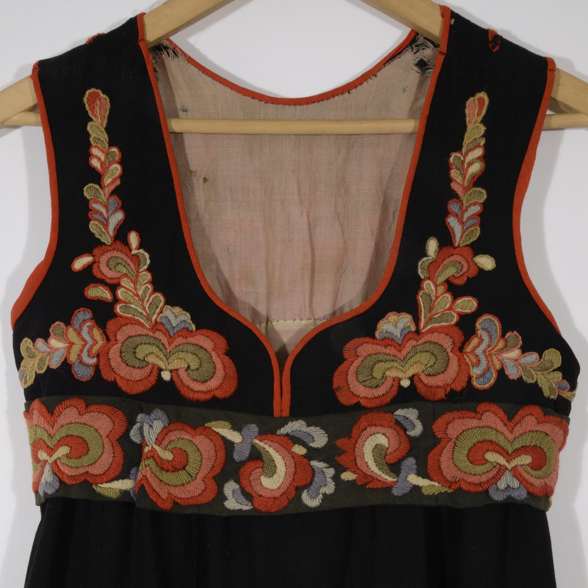Lina fra Vestvågøy skulle stå brud i 1908. Hun ville gifte seg i bunad, og slektninger i Oslo fortalte at Hulda Garborg hadde en drakt til salgs. Den var blitt for liten for Hulda, og derfor solgte hun den. Bunaden har vært i flittig bruk av fire generasjoner, så den er godt slitt.