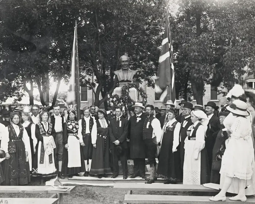 Hulda Garborg og Anders Hovden poserer sammen med norsk-amerikanere foran Ivar Aasen-bysten ved Concordia College i Moorhead, Minnesota.