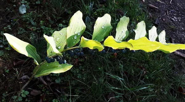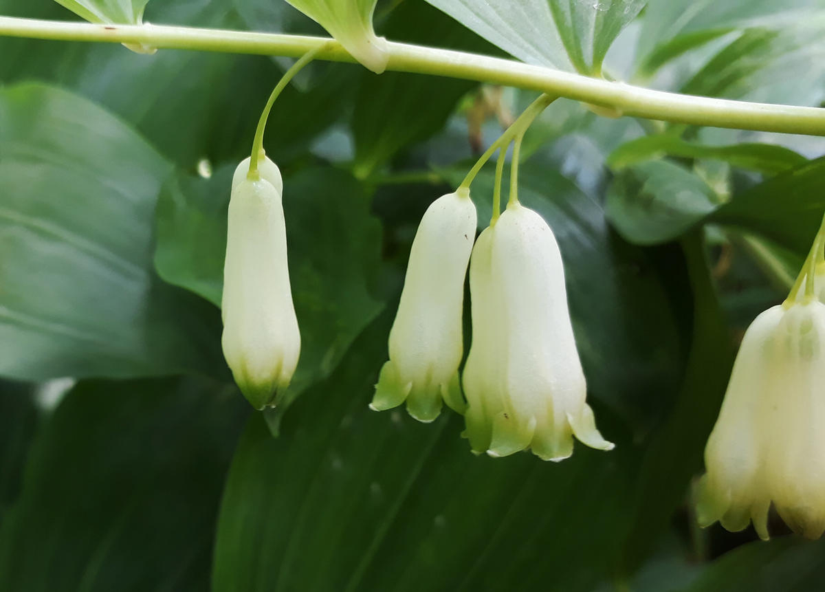 Fra bladhjørnene kommer det knipper med 2-5 hengende, kremhvite, avlange klokkeformede blomster med grønne spisser – 2 cm lange. Litt innsnørt midt på. Dufter ikke. Etter blomstring kommer blåsorte bær. Fin, gul høstfarge på bladene.