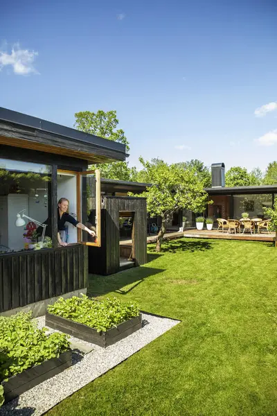 Atriumshusene på Borgenbråten ligger lavt og tett, men er skjermet for innsyn både i hagen og inne i boligen. Husene lukker seg med sine lave, røde teglstensflater mot veien, men åpner seg mot atriet, husets sentrum, med store vindusflater. Skillet mellom ute og inne viskes bort og atriet blir et innelukket rom uten tak. De romslige fellesarealene, som ligger like bortenfor, er tilgjengelige for lek og fellesskap og utgjør en vakker naturkulisse.