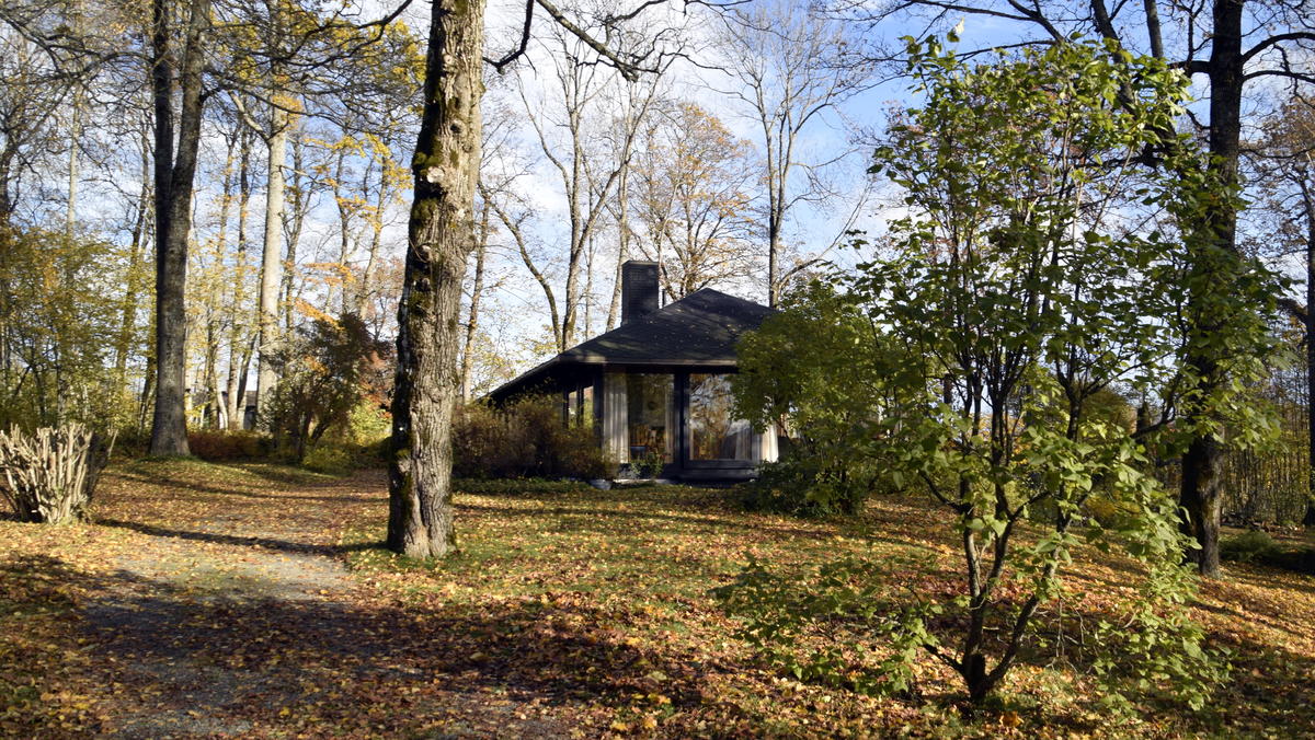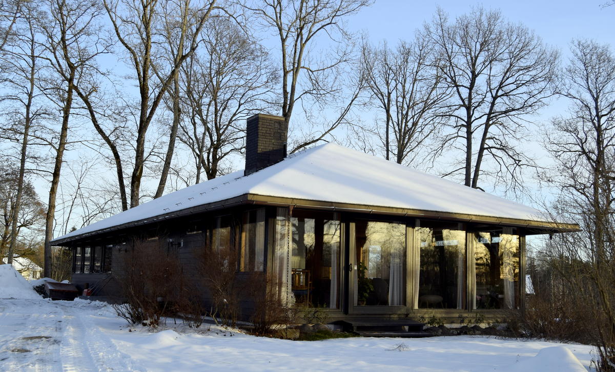 Et valmet tak over en lav, rektangulær bygningskropp smyger seg inn bak knausen i det lille skogholtet som engang ble kalt «Lassaronparken». Tomten er skilt ut fra Mays barndomshjem, Haugbo, og huset sto ferdig i 1963. May og Hans Dølvik var inspirerte av tidens nye, danske småhus.