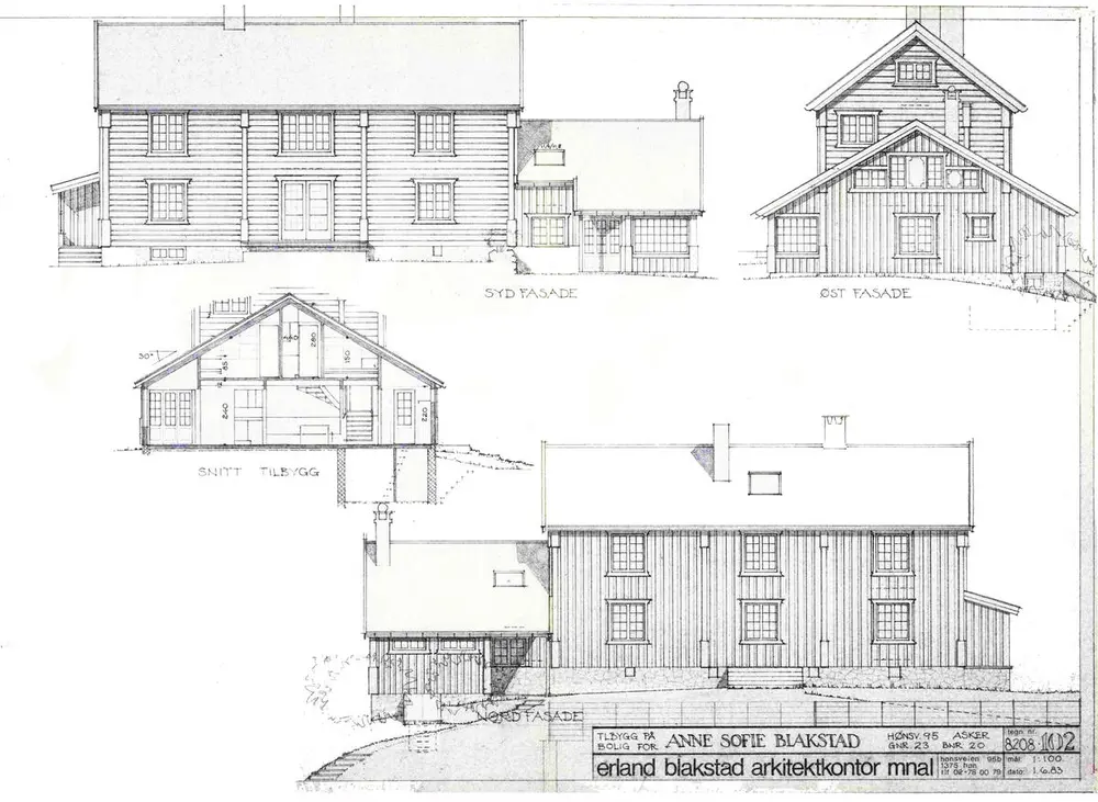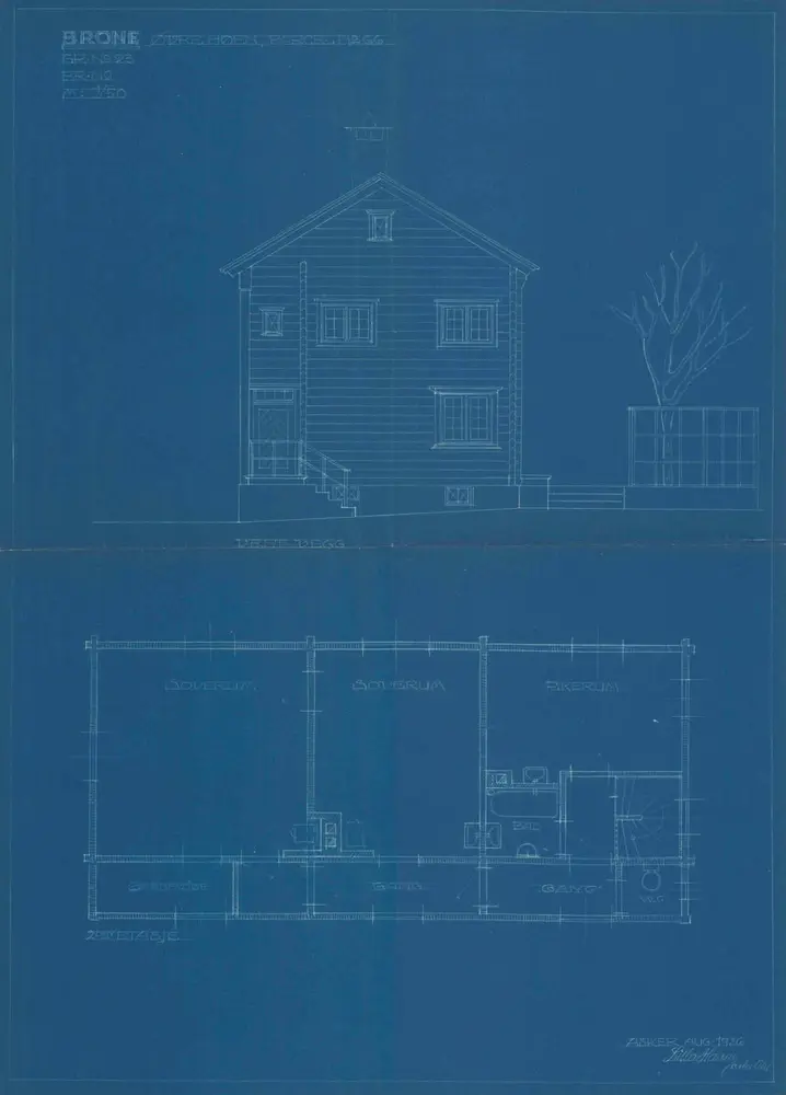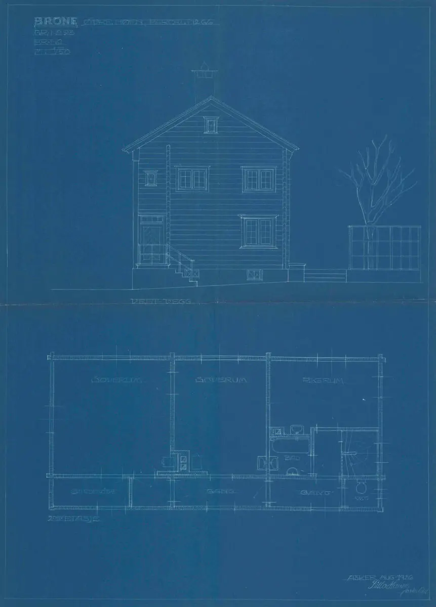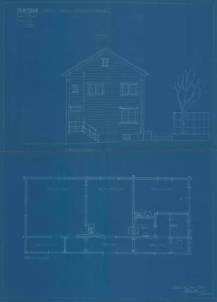 Arkitekt Erland Blakstad tegnet tilbygget til huset som vist på tegningen nedenfor. Den andre tegningen er Lilla Hansens egen fra 1926. Akvarellen tegnet Blakstad som en del av søknaden sin til Arkitekthøyskolen. Den viser peisestuen i Villa Brone.