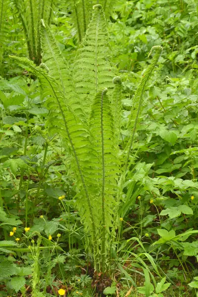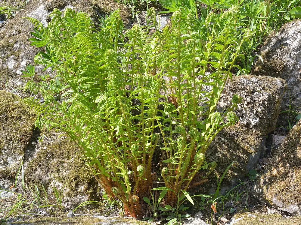 - Ytterst er de høye, gulgrønne, brede og finnete blader som smalner gradvis ned mot bakken. Disse er uten sporer.