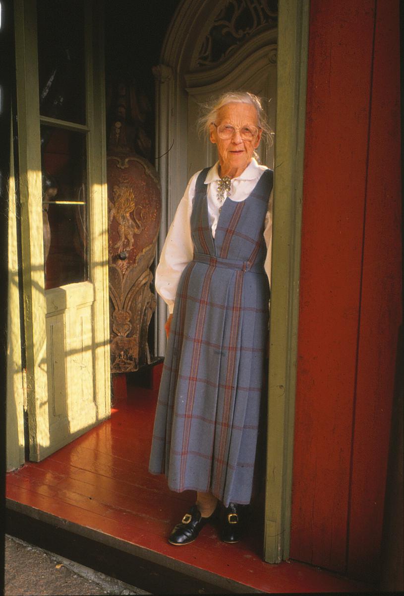 Men best som hun driver i jorda, kommer en buss full av folk som skal til museet. Da er det å kaste av seg hage habitten og få på seg pene klær og vise rundt og fortelle om slik det var for hundre, ja for tusner av år siden. Hun forteller om pløying – om belysningens historie fra tyristikkene og kole, lysestøping og den første lampa som kom fra Frankrike. Hun vet å fortelle om det alt sammen. Men så skal det være rent og noenlunde støvfritt også, og hun må være fullkommen akrobat for å nå til topps og kjempe med støv og kingelvev. Det er gammeldags vedfyring med sot og aske, og det legger seg tykt på skap og stokker, på engler og utskjæringer, på malerier og kroner.