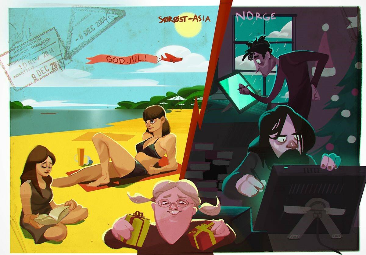 Julekort fra 2014, tegnet av storebror Simon. Kaia og Ninni sitter på stranda, Simon sitter ved tegnebrettet, og Svein gjør det samme i mørket. Mamma Gro deler ut gaver i midten. Egil Nyhus er ikke med på bildet, men han er prikk lik Svein!