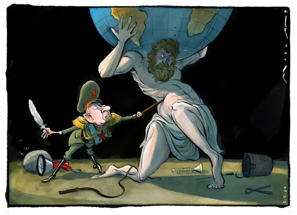 Vi har samlet tegninger fra 38 satiretegnere som har dokumentert året som gikk. Det var et år preget av vedvarende kriger, et kongelig bryllup i Geiranger, en lang rekke med fuske- og habilitetssaker, samt det kontroversielle EU-direktivet om hengslet kork.