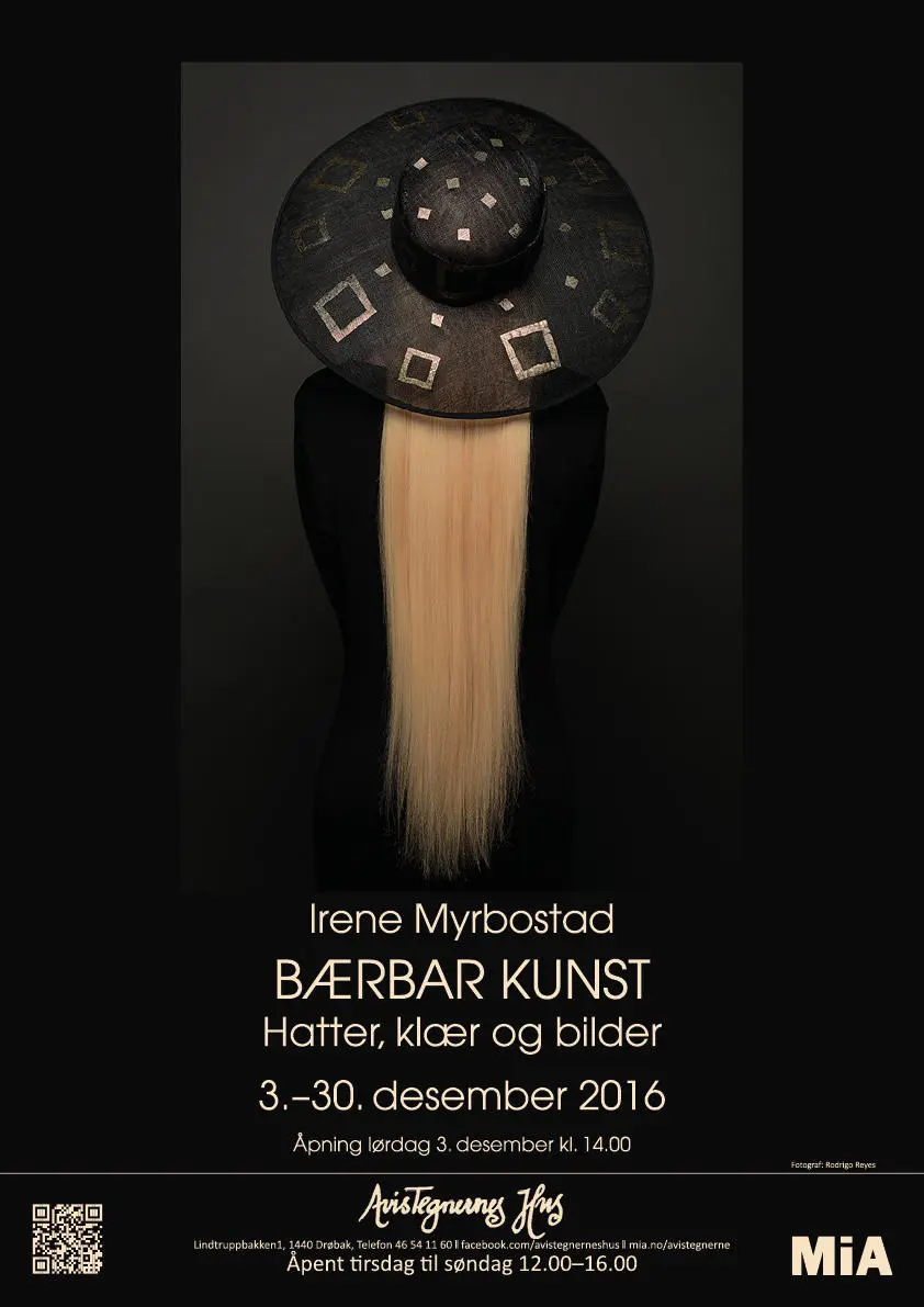 Bærbar kunst Utstilling med hatter, klær og bilder av Irene Myrbostad Irene Myrbostad: Bærbar kunst Utstilling, Avistegnernes hus 3.–30. desember 2016 1/2 Åpne eller lukk bildetekst
