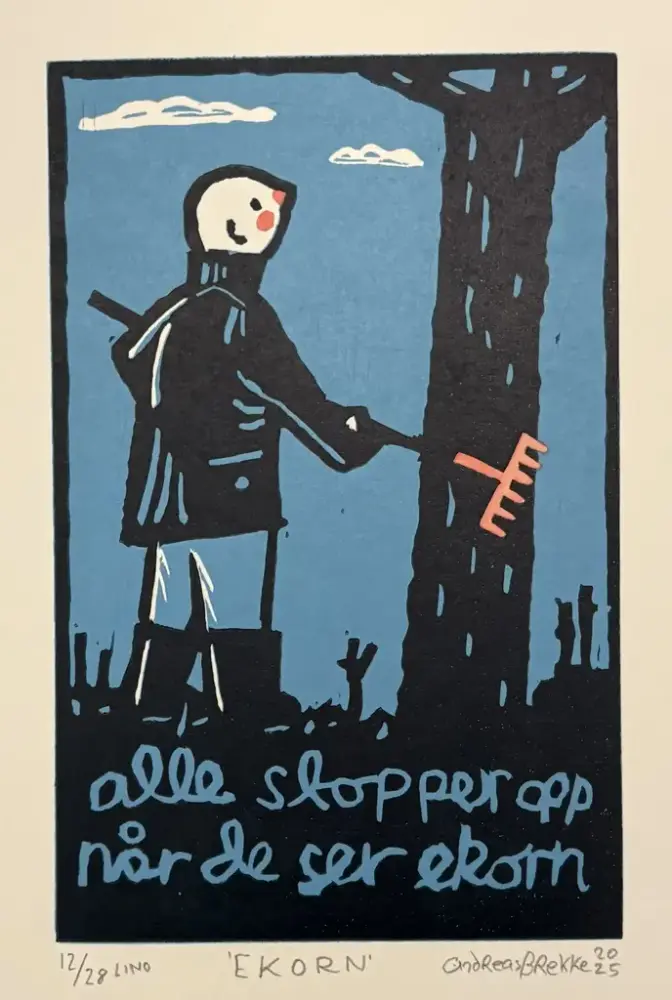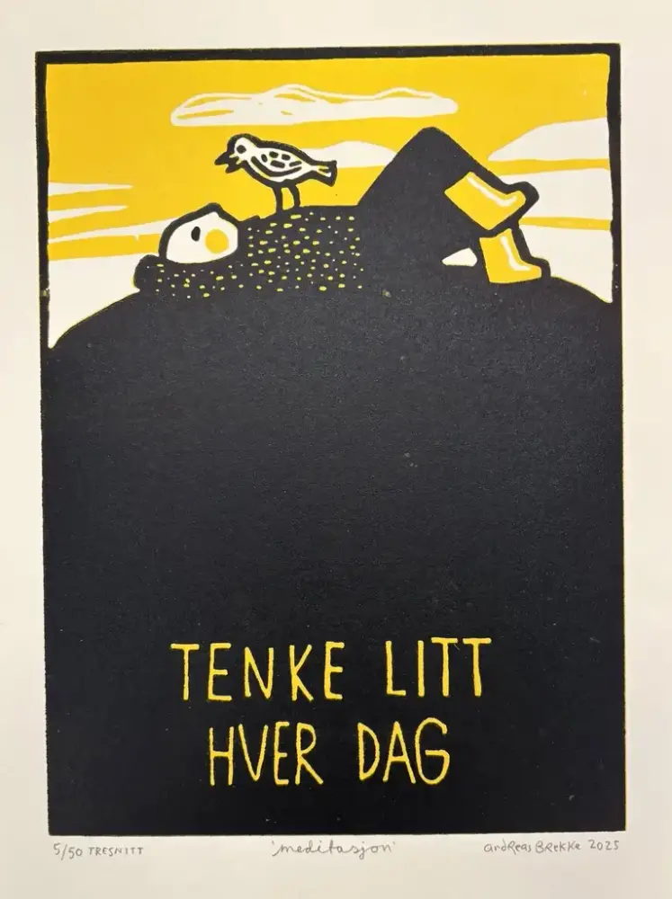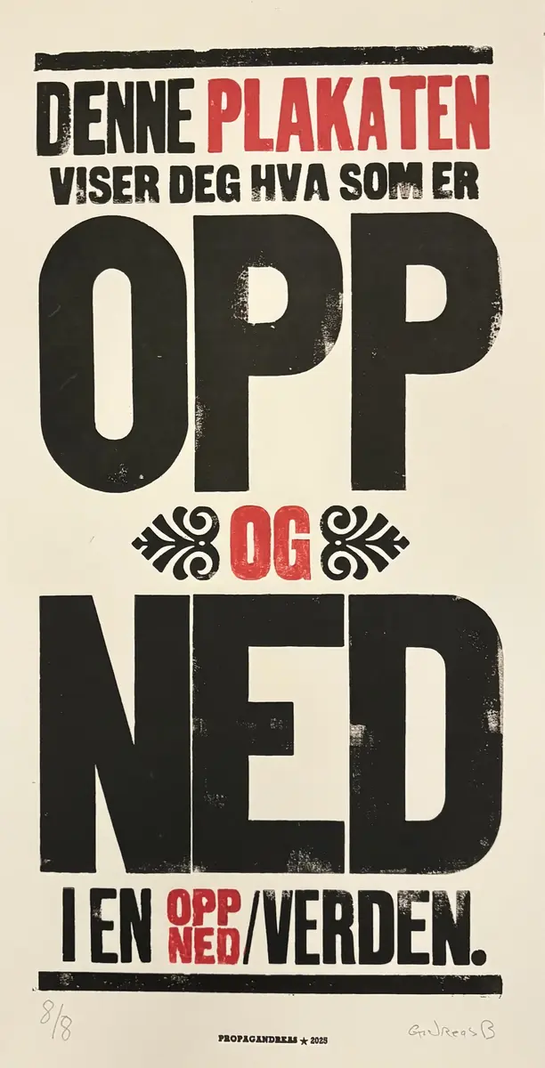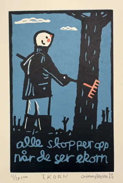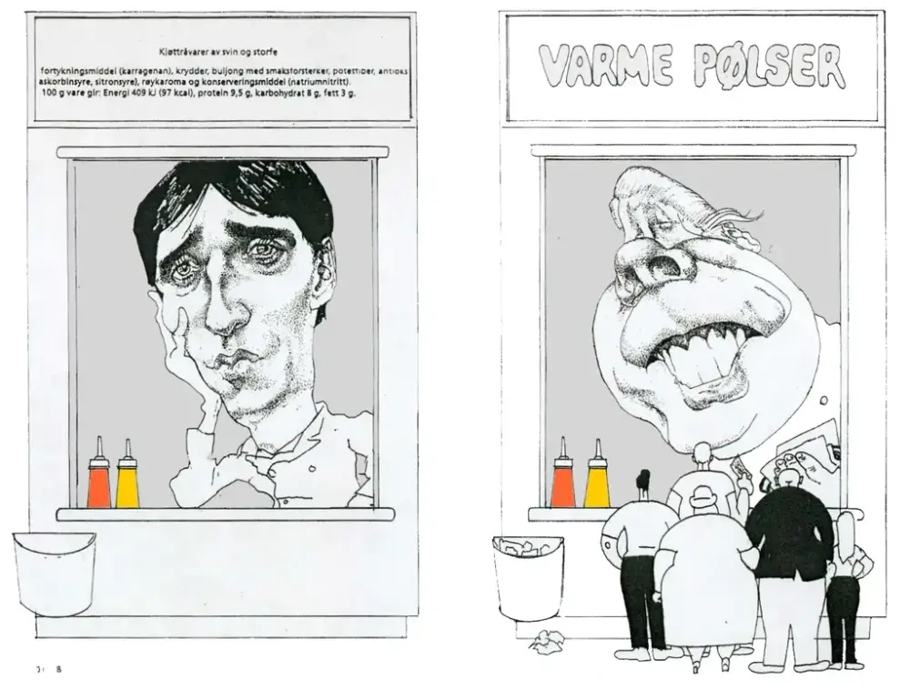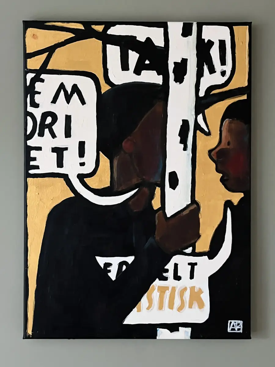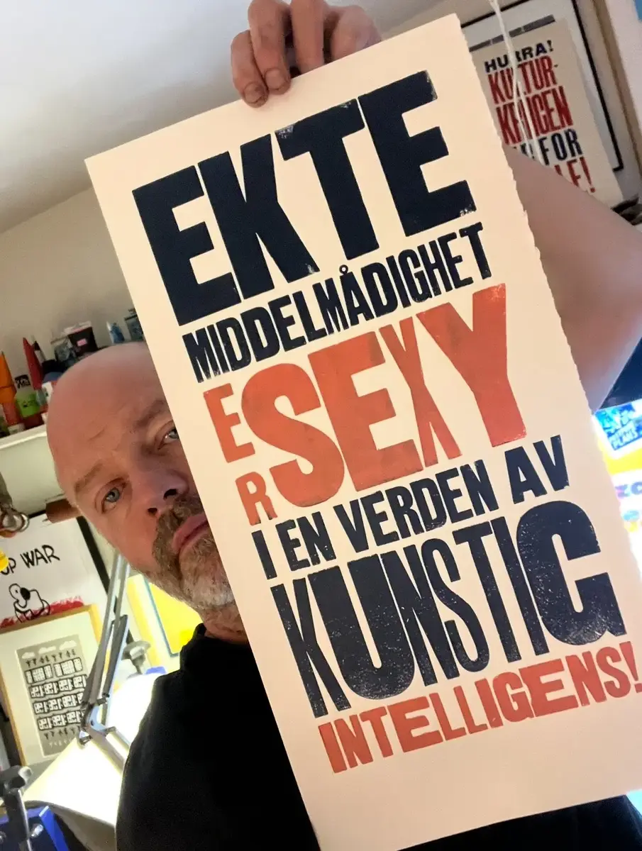 – Eg ser for meg ein litt raudvins-brisen type i svart polo-genser, som seier litt sarkastisk til sidemannen: "Se her ja! More is more". Sidemannen, med kvitvin i glaset, kvite bukser og kvite joggesko, svarar i same tone: "Ei ulmande pipe, du. Nynorsk. Glødende originalt." Så går dei vidare til neste verk.