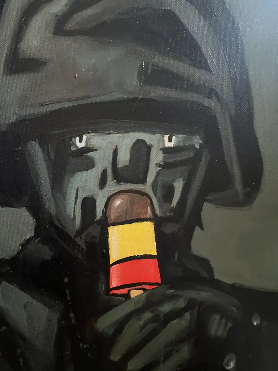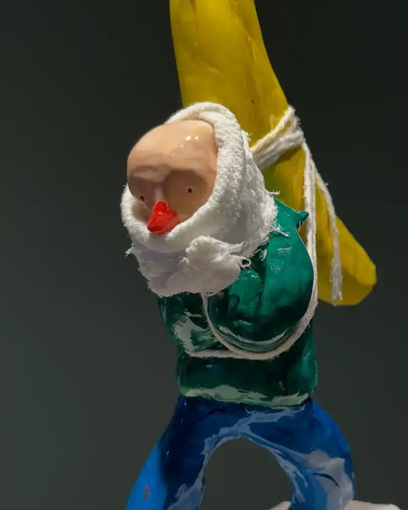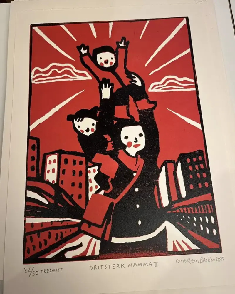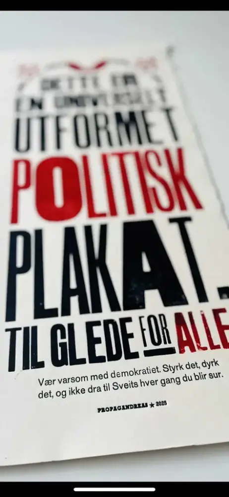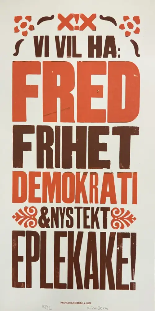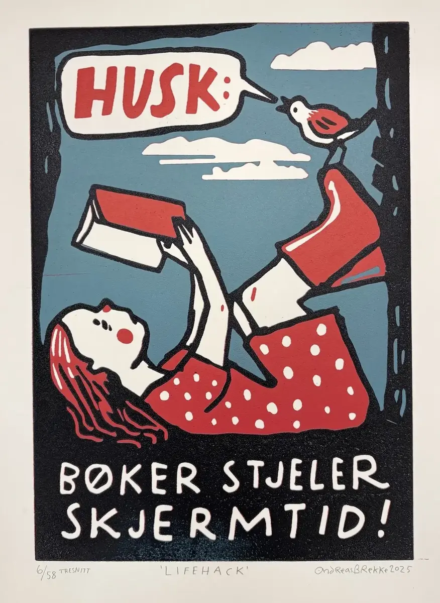 – Eg ser for meg ein litt raudvins-brisen type i svart polo-genser, som seier litt sarkastisk til sidemannen: "Se her ja! More is more". Sidemannen, med kvitvin i glaset, kvite bukser og kvite joggesko, svarar i same tone: "Ei ulmande pipe, du. Nynorsk. Glødende originalt." Så går dei vidare til neste verk.