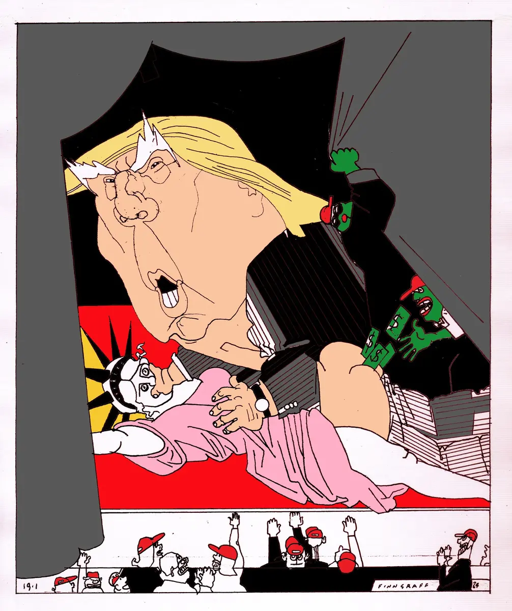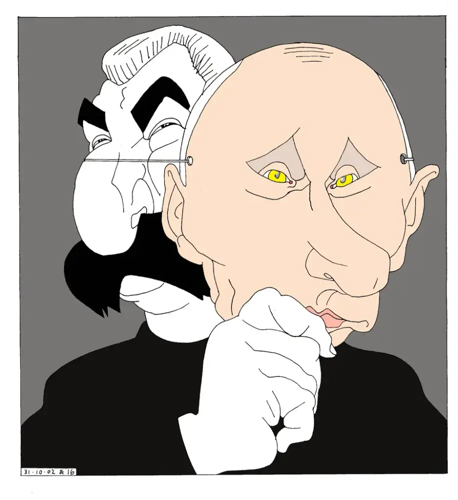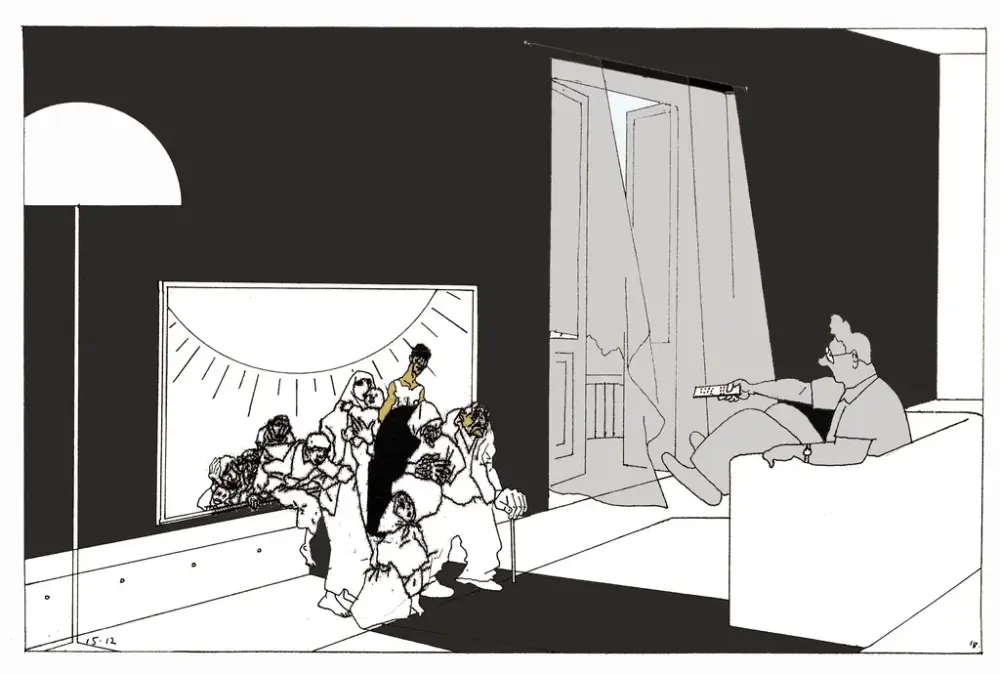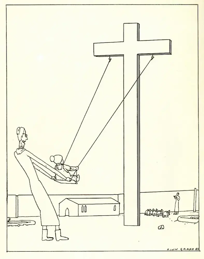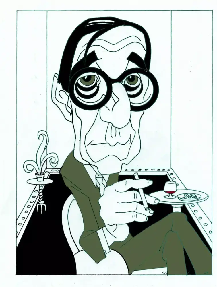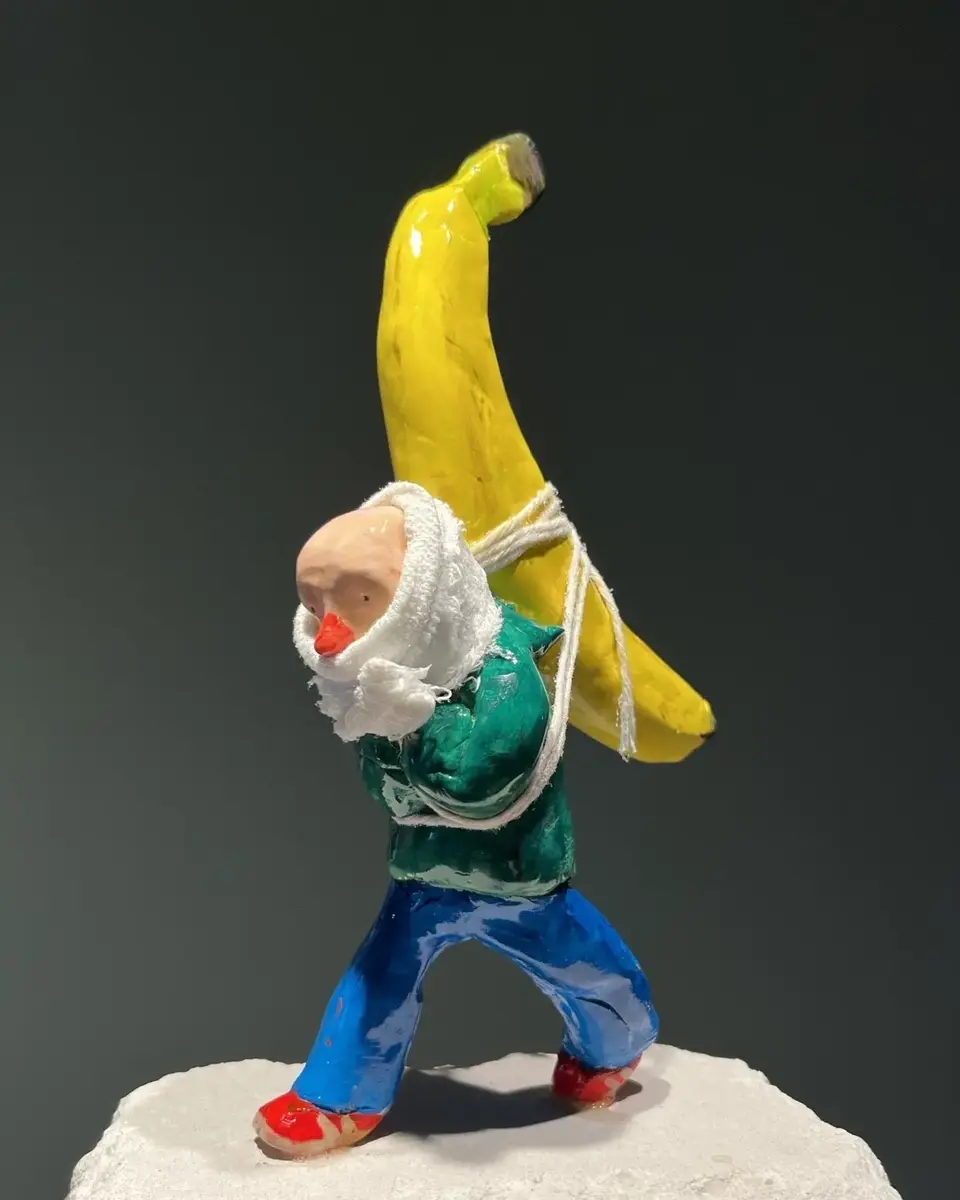 – Eg ser for meg ein litt raudvins-brisen type i svart polo-genser, som seier litt sarkastisk til sidemannen: "Se her ja! More is more". Sidemannen, med kvitvin i glaset, kvite bukser og kvite joggesko, svarar i same tone: "Ei ulmande pipe, du. Nynorsk. Glødende originalt." Så går dei vidare til neste verk.
