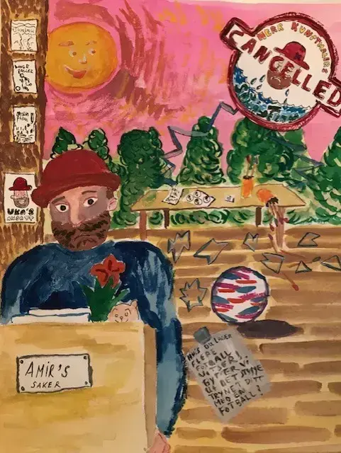Amir: Satireklubb cancelled, maleri på papir 24x32cm kr 3000