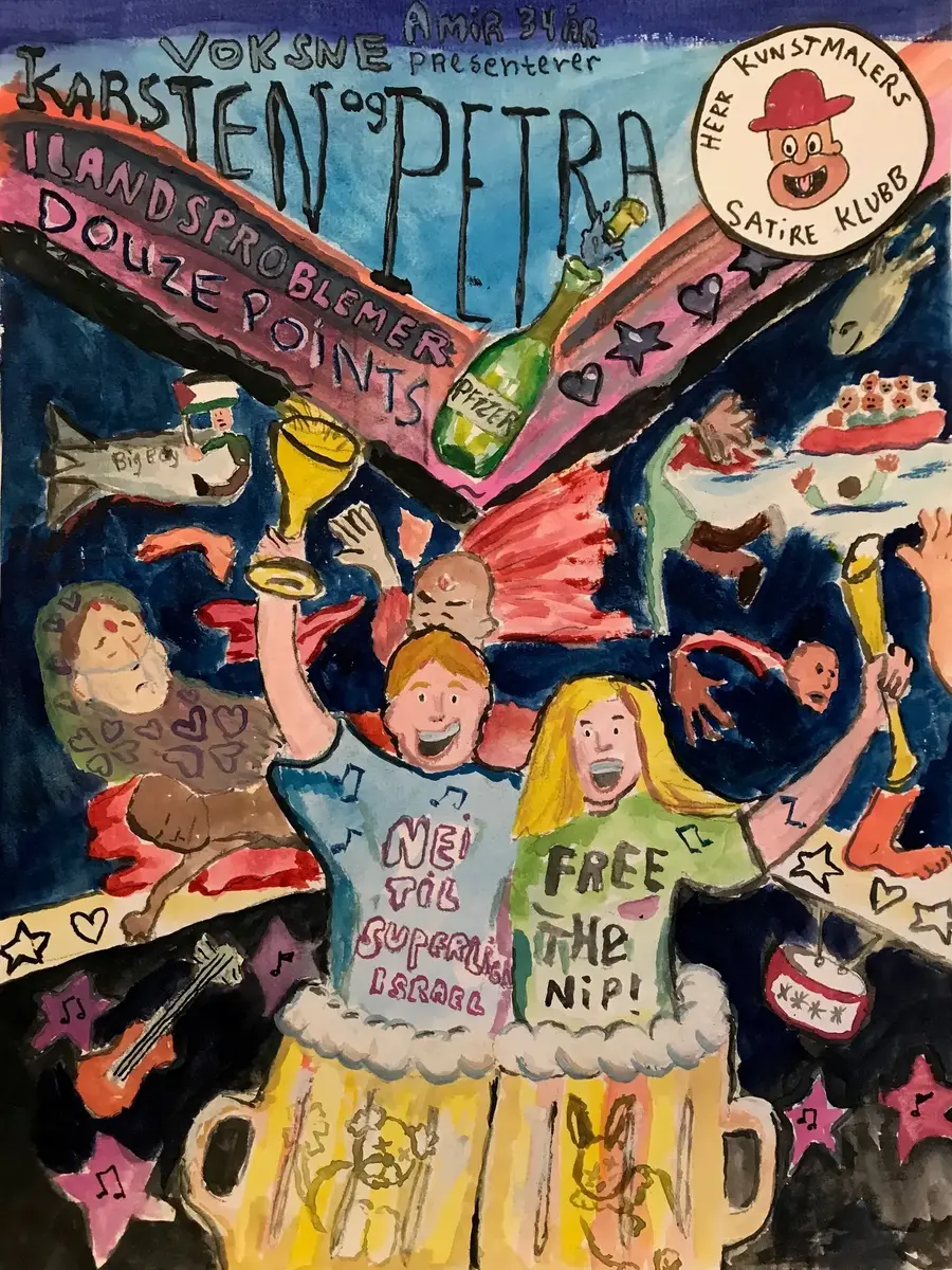 Amir: Karsten og Petra satireklubb, maleri på papir 24x32cm kr 3000 - 3/4