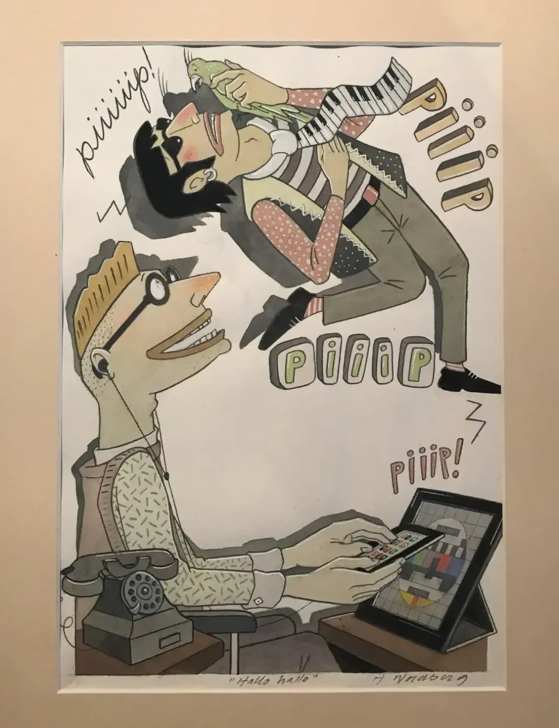 Harald Nordberg: Hallo hallo (Knudsen og Ludvigsen) tegning på papir, 35x44 cm inkl passepartout, kr 2000 - 2/4