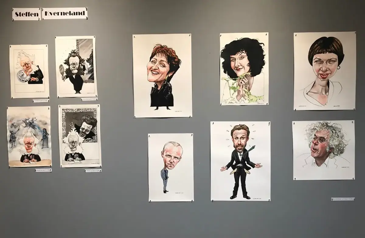 Endelig har vi originale akvareller signert Steffen Kverneland i galleriet. Selvfølgelig er alle bøkene hans i bokhandelen også, ikke minst årets BRILLEGEIT. På veggen er et utvalg portretter av kjente nordmenn.