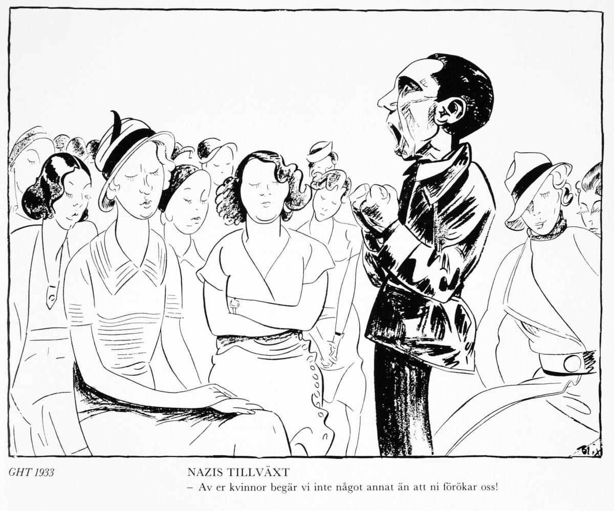Ragnvald Blix (1882-1958) tegnet i Göteborgs Handels & Sjöfartstidning under annen verdenskrig. Tegningene fikk stor betydning for opinionen i Sverige og motstandsbevegelsene i Norge og Danmark. Per Krohg (1889-1962) deltok under første verdenskrig i Den norske Skiløperambulansen ved fronten i Frankrike og fraktet vekk sårede på «nansen-kjelker». Krohg leverte ukentlige kommentartegninger til avisen Tidens Tegn.