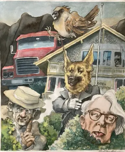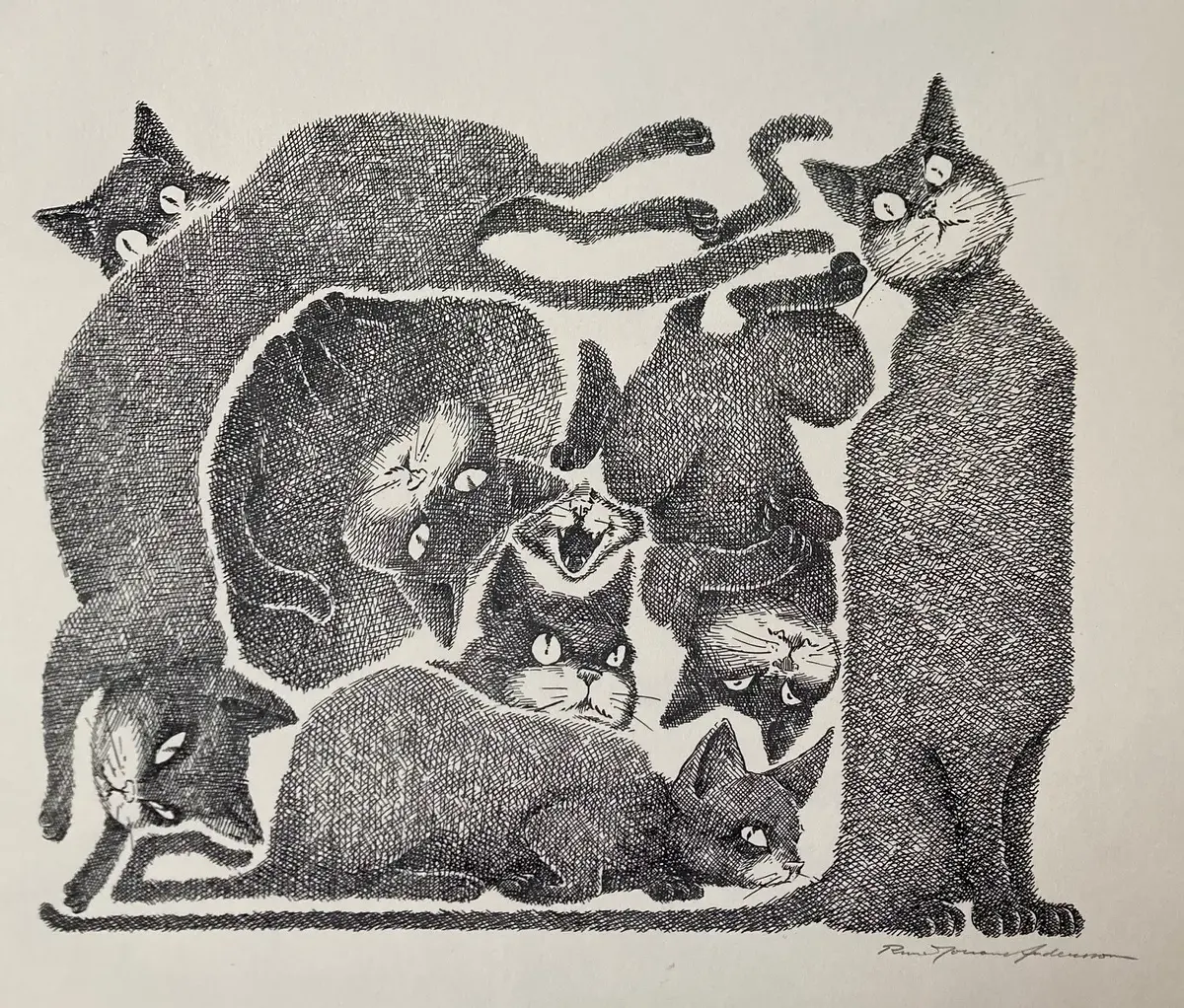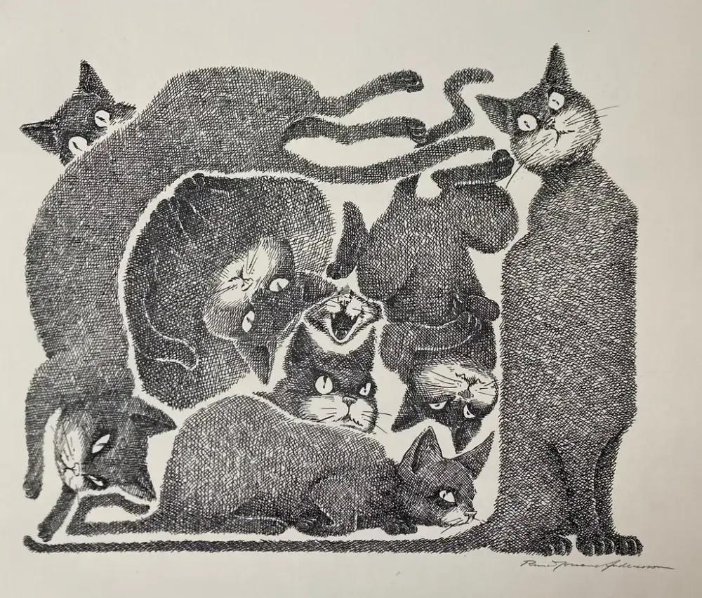 Vi har fått meske oss i Anderssons frodige originaltegninger fra en tid der kunstnerisk frihet rådet i avisene. Vi har også valgt noen av hans flotte bokillustrasjoner, for å vise bredden i kunstnerskapet. Blant disse er originale pennetegninger til Lars Saabye Christensens diktsamling Mann for sin katt. Det blir også Saabye Christensen som åpner utstillingen lørdag 27. april kl. 12.