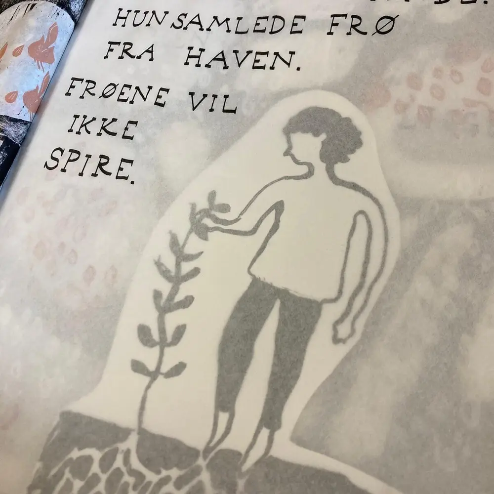 Mathilda Skoglunds (SE) praksis baserer seg på kunstnerbøker, poesi og grafiske trykkemetoder. Med boken som medium skaper hun en nær kommunikasjon mellom materialitet og romlighet. Det langsomme arbeidet med gammeldagse blytyper muliggjør en nærhet til teksten, som for Skoglund står i kontrast til de mange raske mediumene som ellers brukes til tekst. Skoglund går i sitt siste år på bachelorutdanningen medium- og materialbasert kunst, grafikk og tegning på Kunsthøgskolen i Oslo.