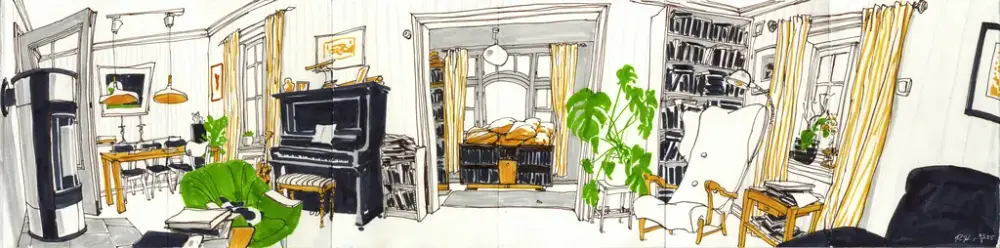 Per Ragnar Møkleby har laget illustrasjoner for aviser og tidsskrifter, skolebøker og barnebøker, plakater og foldere. Han hadde stor utstilling av egne arbeider i Avistegnernes hus i 2020. De siste årene har han blitt hekta på skisseboka og det å bruke tegning og tekst som en måte å forholde seg til verden på, samle minner og leke i hverdagen. Gjennom sine tegnekurs inspirerer han og lærer bort både teknikker og måter å observere på, og han er nærmest en legende i Urban Sketching miljøet. Etter sterkt press fra vårt hold har han gått med på å ta med noen av uttrekksbøkene på vår salgsutstilling. Bare å glede seg!