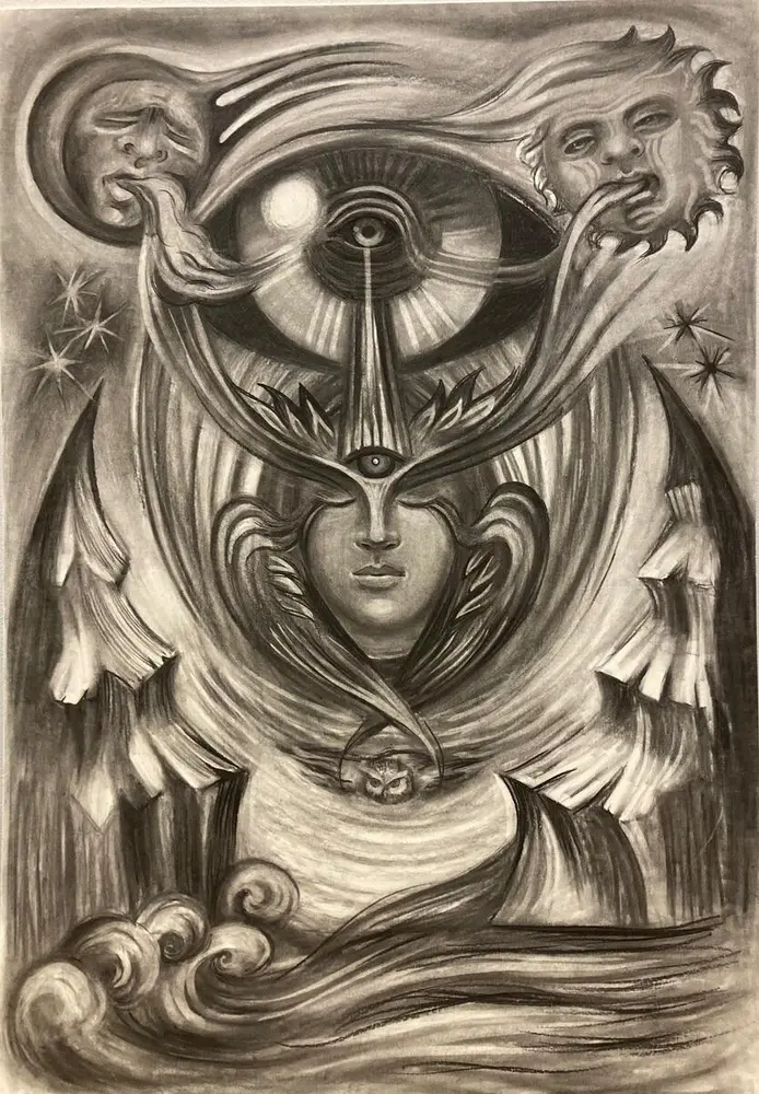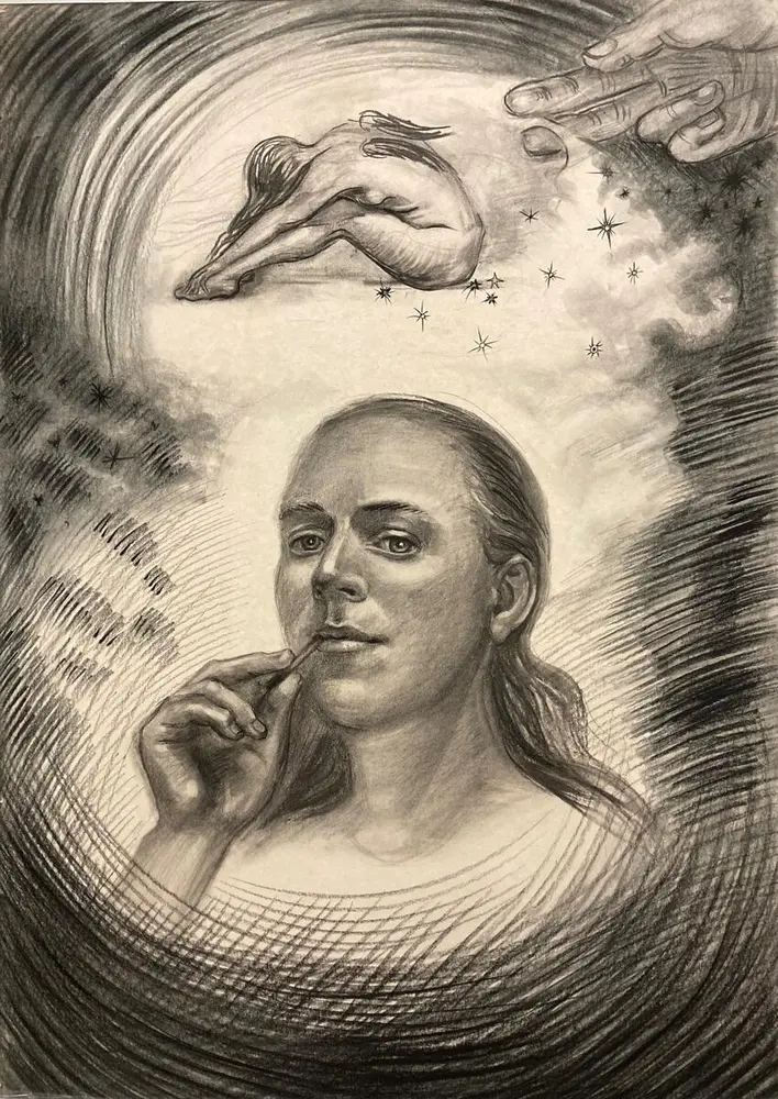 I utstillingen Kontemplasjoner hos Avistegnernes hus i Drøbak, møter vi en ettertenksom Morozova i et billedunivers som er i bevegelse: Her finner vi symboler både fra den religiøse og den verdslige verden, fra det spirituelle og det naturlige, der det indre og det ytre flyter over i hverandre. Hvor skal vi snu oss når omstendigheter utenfor vår kontroll tvinger oss til å sitte stille og vente? Når omgivelsene våre er i endring og de vante elementene flytter på seg uten at vi vet hvor de skal ende?